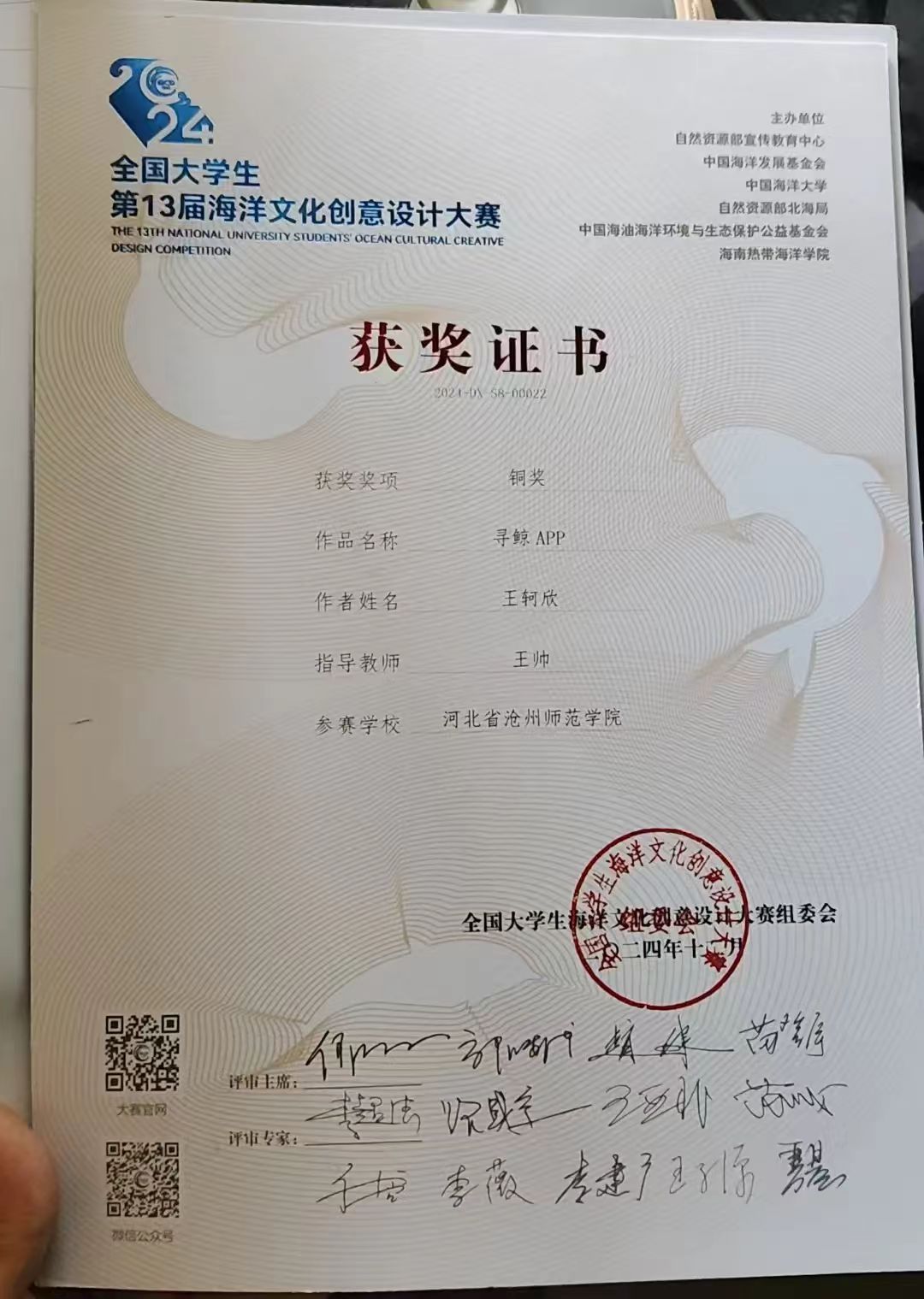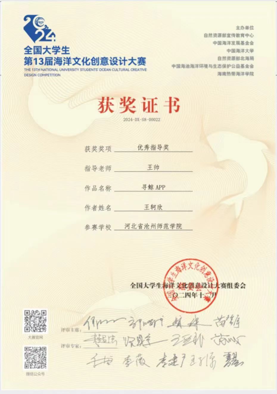 此外,王轲欣同学在王帅老师的指导下,以其优秀设计作品《寻鲸》APP惊艳亮相。她从自身饱受睡眠困扰的经历出发,敏锐洞察不同人群的睡眠需求,将深海静谧的画面、鲸鱼独特的赫兹与渐变蓝等海洋元素巧妙融合,以专业的设计手法完成从图标到交互界面的创作。这款APP不仅为用户打造了放松身心的睡眠“避风港”,更以创新思维诠释了人类与海洋共生的理念,最终荣获铜奖。王帅老师凭借深厚的专业素养与耐心指导,荣获优秀指导奖。