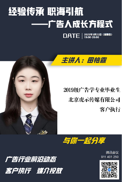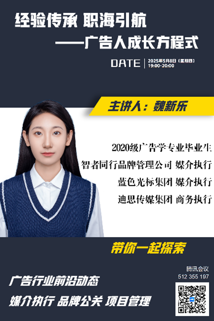 为深入贯彻落实产教融合战略,充分发挥校友资源优势,构建校友与在校生长效互动机制,助力学生精准把握行业动态、科学规划职业发展,4月至5月,由齐越传媒学院主办、广告学教研室承办的“师哥师姐说·经验传承 职海引航——广告人成长方程式”系列线上讲座活动成功举办。活动通过邀请四位扎根于不同领域的优秀毕业生,为在校生带来了关于行业前沿、职场实战与个人成长的宝贵分享,活动反响热烈。 启动仪式:寄语未来,锚定方向 4月24日晚7点,系列讲座首期活动在线上平台开启。齐越传媒学院党总支书记潘治钢出席启动仪式并致辞。潘治钢高度肯定了此系列活动的深远意义,他指出:“齐越传媒学院始终致力于学生的成长与发展,积极对接优质资源,构建党建引领下的‘产学研’一体化育人平台。从行业大咖到校友导师,每一场分享都是连接校园与职场的坚实桥梁。‘经验传承 职海引航’活动主题精准体现了广告专业‘以行业需求为导向’的办学理念。”他殷切期望同学们通过持续学习,努力成为具备敏锐洞察力、卓越创造力和高效执行力的新时代广告人才。学院副院长安琪、广告学教研室主任于园园及教研室全体教师全程参与了系列活动。 四期精彩:多元视角,深度解码 本次系列讲座汇聚了广告学专业四位优秀校友的智慧结晶,每期聚焦不同职业领域,为师弟师妹们奉上了丰盛的“职场成长秘籍”: 首期:解码客户执行,启航职场之路 由2019级毕业生、中国广告长城奖获得者袁瑞瑞主讲。袁瑞瑞结合自身经历,系统分享了客户执行岗位的核心业务范畴、典型工作节奏、代表性项目案例、薪资结构及清晰的晋升通道,并提供了极具实操性的职业规划建议。互动环节气氛热烈,在校生就实习、考研就业抉择等踊跃提问,袁瑞瑞耐心解答,令参会学生收获满满。副院长安琪对袁瑞瑞的倾囊相授给予高度评价。