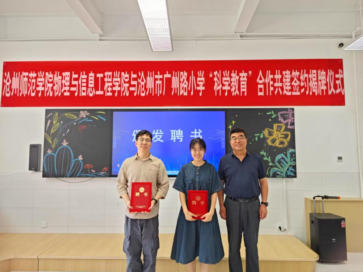 物理与信息工程学院院长黄晓寸与冯连砖代表双方签署合作共建协议。黄晓寸被聘为广州路小学科学副校长,刘业堃、吴沫虹被聘为科学教育顾问。冯连砖为受聘人员颁发聘书,搭建起高校专家与小学科学教育的直接桥梁。