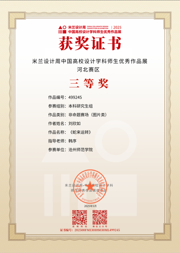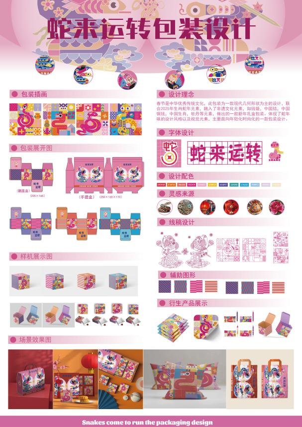 《蛇来运转》此包装为一款现代几何形状为主的设计,联合2025年生肖蛇年元素,融入了非遗文化元素,如钱袋,中国结,中国铜钱,中国生肖,牡丹等元素,做出的一款蛇年礼盒包装。 获奖学生赵靖雯表示:"从最初的草图构思到最终完稿,整个创作过程经历了多次修改调整。在塑造农蔬 IP 形象时,平衡农作物特征与卡通造型的比例,使 IP 五官比例更符合现代萌宠审美。这次获奖让我深刻认识到,要在不断尝试创新中找到传统与现代的融合点。未来我会继续深耕乡村文创领域,用更多充满创意的设计为乡村文化振兴贡献力量。” 刘欣如则分享道:"包装设计不仅是视觉呈现,更是文化叙事的载体。很荣幸作品能获得认可,这激励我在后续创作中继续探索非遗元素的当代转化路径。感谢老师悉心指导!从创意启发到细节打磨,您用专业与耐心为我点亮灵感。这份荣誉凝聚着您的心血!这个奖项是对我的极大鼓励,未来我会保持热忱,不断突破自我,用设计传递更多美好与创意。" 指导教师团队代表表示:"米兰设计周作为具有国际影响力的赛事,对学生的创意构思与落地执行能力要求极高。看到学生们将课堂所学与文化传承相结合,在省级赛事中脱颖而出,我们深感欣慰。这也印证了我院 ' 以赛促教、以赛育人 ' 的教学理念成效。" 赛事背景 米兰设计周全国高校设计大赛是国内设计教育领域的重要赛事,以 "设计赋能生活" 为宗旨,致力于推动高校设计学科发展与创新人才培养。河北省省赛作为区域重要选拔平台,汇聚了全省高校的优秀设计作品,评审标准涵盖创新性、文化性、实用性等多个维度。 此次获奖是美术学院在设计类赛事中的又一突破,充分彰显了我院在应用型人才培养方面的成果。学院将继续深化 "产教融合、赛教结合" 的教学模式,鼓励学生参与高层次赛事,以国际视野提升专业能力,让更多优秀设计作品绽放光彩。 让我们再次祝贺获奖同学,期待美术学院学子在未来的设计征程中再创佳绩,用创意画笔描绘更多传统文化与现代设计交融的精彩篇章!