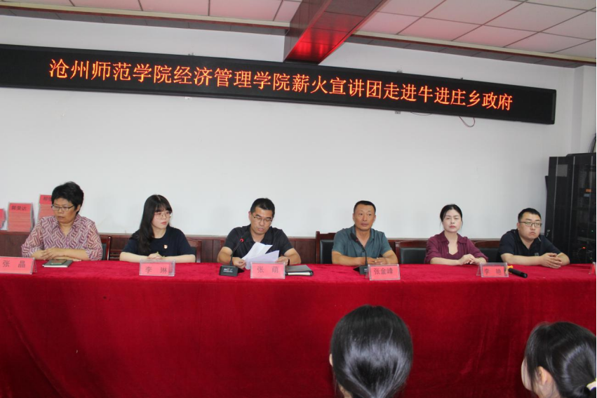汇聚青春之智,赋能乡村振兴。为深入学习贯彻习近平新时代中国特色社会主义思想,感悟领袖关怀,汲取奋进力量,为乡村振兴建设注入青春智慧,7月10日上午,经济管理学院薪火宣讲团走进孟村回族自治县牛进庄乡政府,开展以“习近平总书记在河北的足迹”为主题的大学生暑期社会实践活动。此次活动旨在以青年之声传递时代强音,以实践之力赋能乡村振兴,将理论学习成果转化为服务基层的生动实践,经济管理学院党总支书记张金峰、副书记李艳、团总支书记李琳以及经济管理学院教师代表,伟德驻东赵河村干部韩钰参加活动。