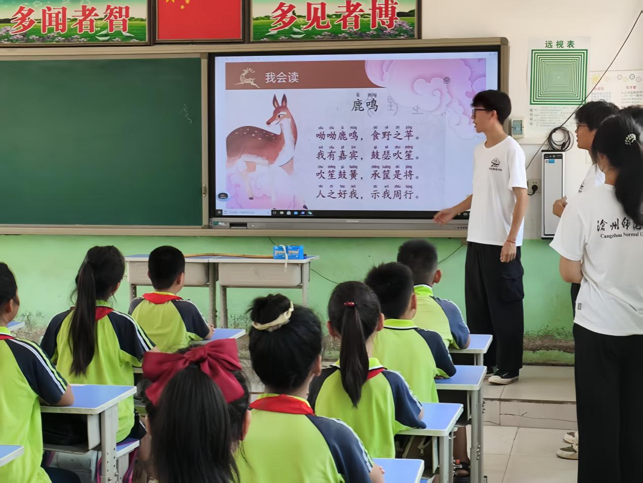 青年团成员以“为何《鹿鸣》能穿越千年仍被传唱”为引子,向同学们生动介绍《诗经》的文化地位与沧州地区深厚的诗经文化底蕴。“‘呦呦鹿鸣,食野之苹。我有嘉宾,鼓瑟吹笙’这不仅是古人宴饮嘉宾的歌声,更是对真诚、友善的赞美。”团员们用标准的普通话逐句讲解诗中意象与情感,结合生活场景解读“鹿鸣”的象征意义,让孩子们在理解诗意的同时,感受普通话表达的精准与优美。