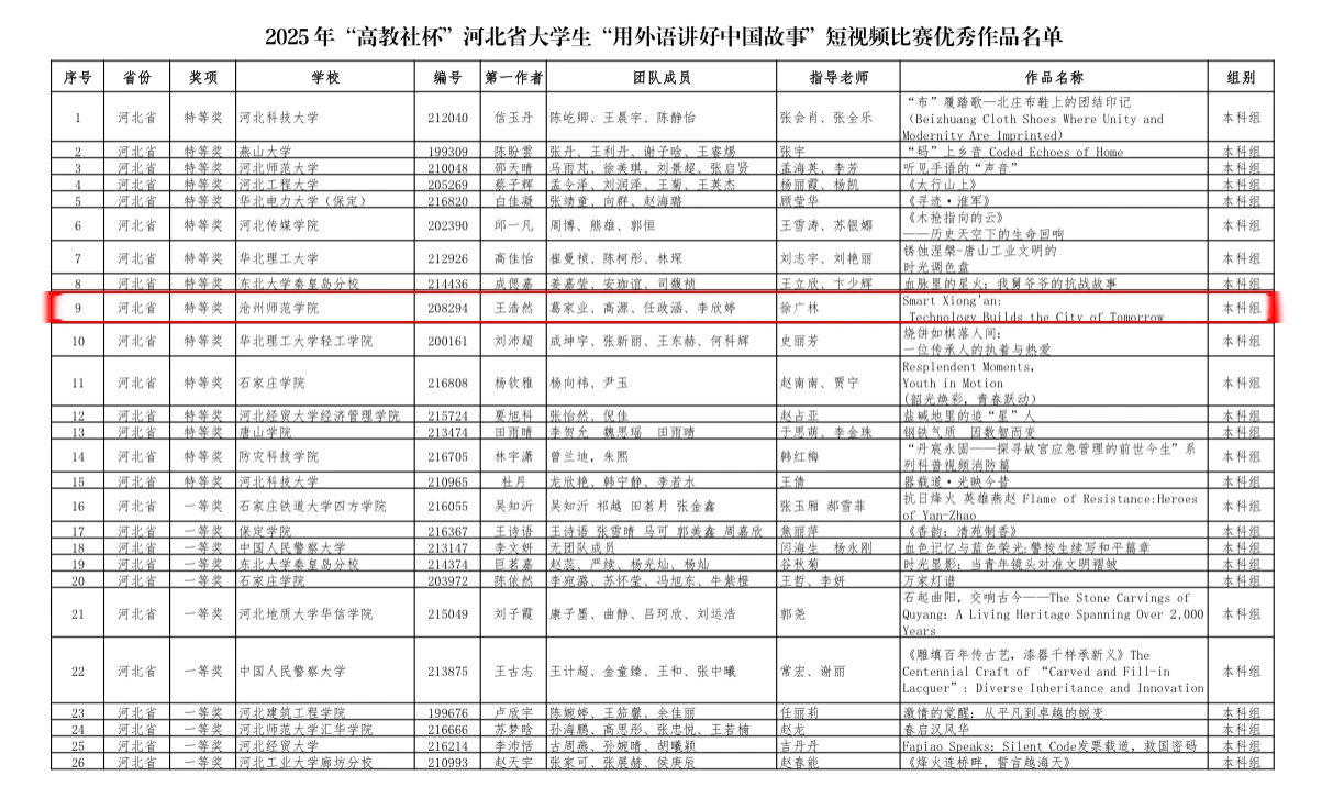 近日,2025 年 “高教社杯”大学生“用外语讲好中国故事”优秀短视频作品征集活动省级评选结果揭晓。外国语学院学生王浩然、葛家业、高源、任政涵、李欣婷组成的团队,在外国语学院副院长徐广林指导下创作的《Smart Xiong'an: Technology Builds the City of Tomorrow》获河北省特等奖。