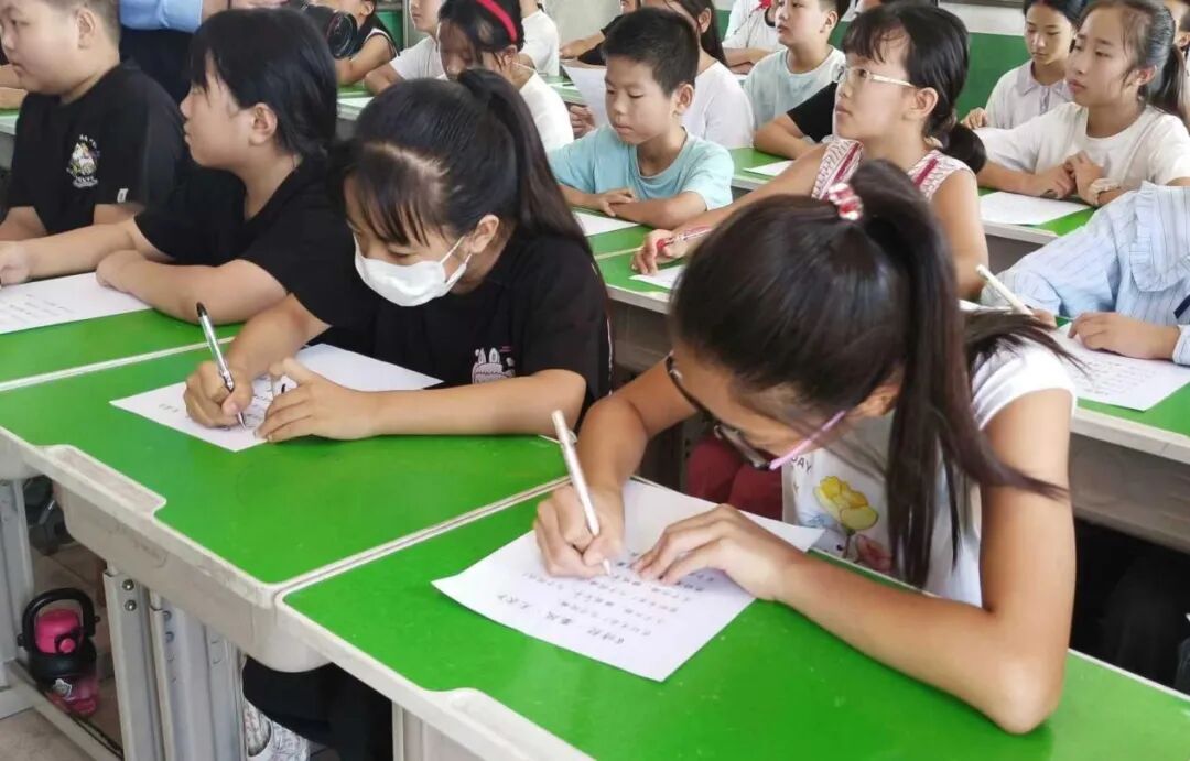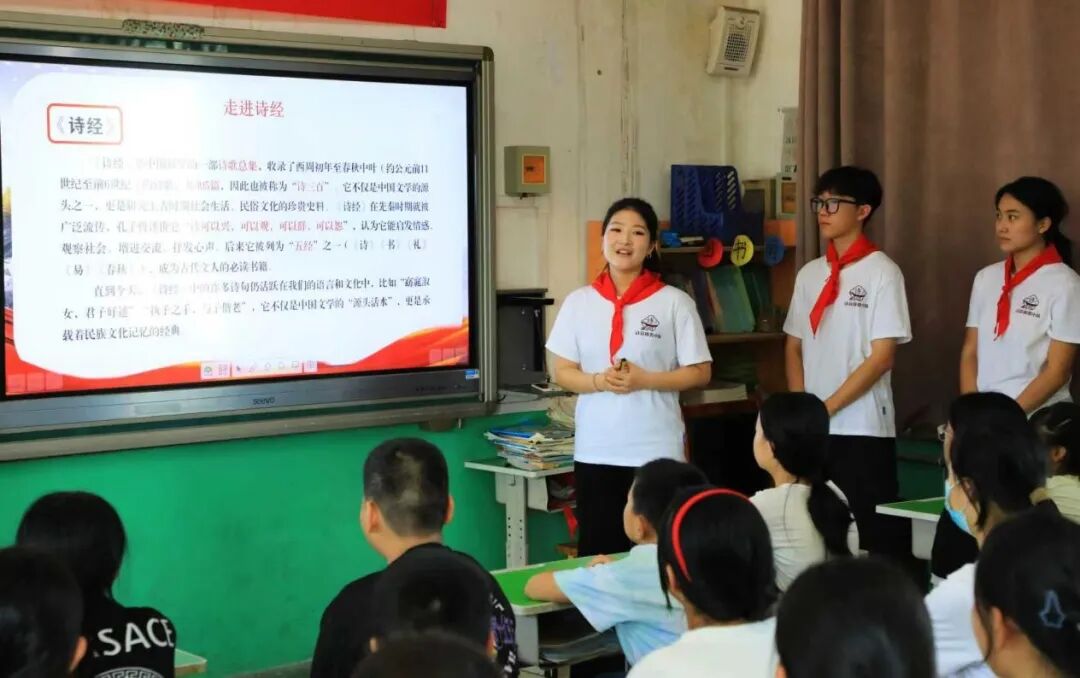 活动伊始,齐越传媒学院师生带领小学生们齐声诵读《诗经·秦风·无衣》等经典篇目,铿锵有力的诵读声在校园内回荡。“岂曰无衣?与子同袍……”孩子们在朗朗诵读中感受古代战士保家卫国的壮志豪情,并与抗战时期中华儿女团结御敌的精神相呼应。课堂上,青年团成员通过多媒体展示、互动问答等形式,生动讲解《诗经》的文化价值及其与南皮县的地域渊源,激发孩子们对传统文化的浓厚兴趣。