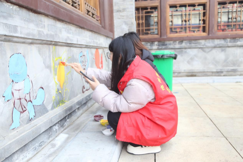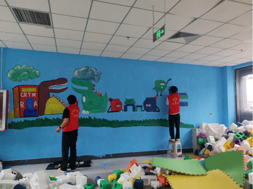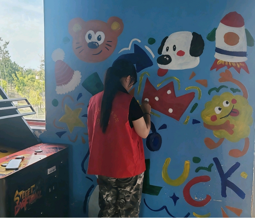 在此次活动中,美术学院的学生志愿者们充分发挥专业特长,用画笔和色彩为好客欢乐城的墙面进行了精心绘制。从最初的构图设计,到精准的线条勾勒,再到色彩的细致铺陈,每一个环节都凝聚了志愿者们的心血和智慧。他们反复打磨,力求将每一幅作品都做到完美,让原本单调的墙面焕发出了全新的生命力和艺术魅力。