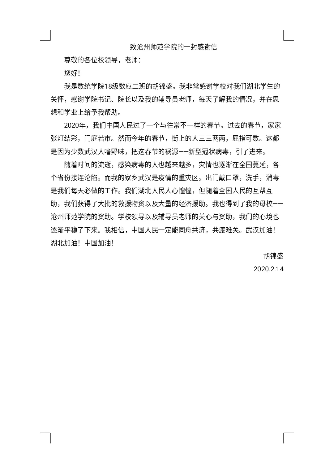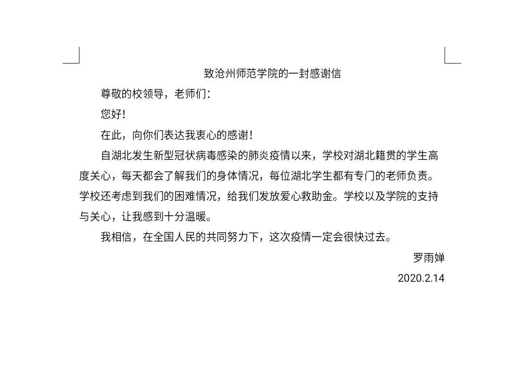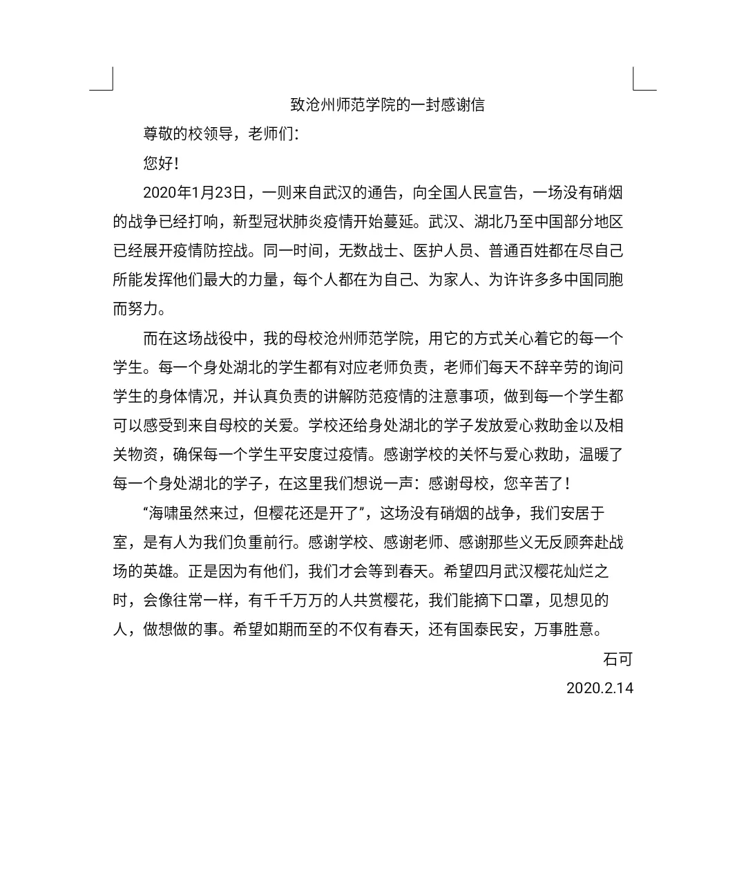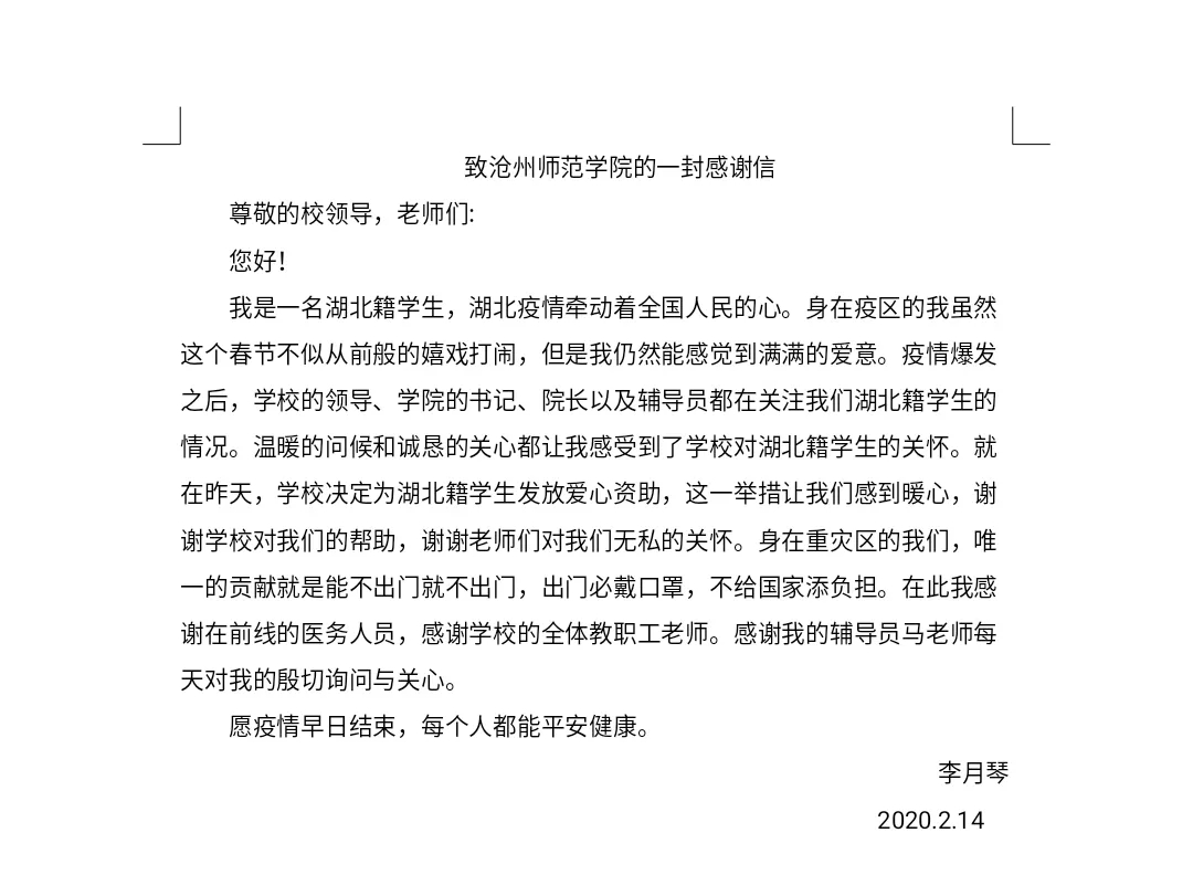 新型冠状病毒疫情发生以来,学生们的身体健康状况成了数学与统计学院最大的关注,特别是身在湖北的数统学子们,学院时刻心系着他们及其家人的平安健康。为此,数学与统计学院的老师们积极响应学院党委号召,按照学院统一部署,迅速从假期状态切换到工作模式,坚守岗位,勇担责任,与学生们心连心,通过一对一包联责任制,在实际行动中践行初心使命。学院师生也自发为湖北籍学生录制爱心视频,为他们鼓劲加油。在鄂同学通过辅导员老师,向关心他们的学院和老师们转达自己的近况:“我们在湖北,向大家报平安啦!”并为我们送来感谢信,表示感谢学校的慰问金和学院领导和老师的关怀。