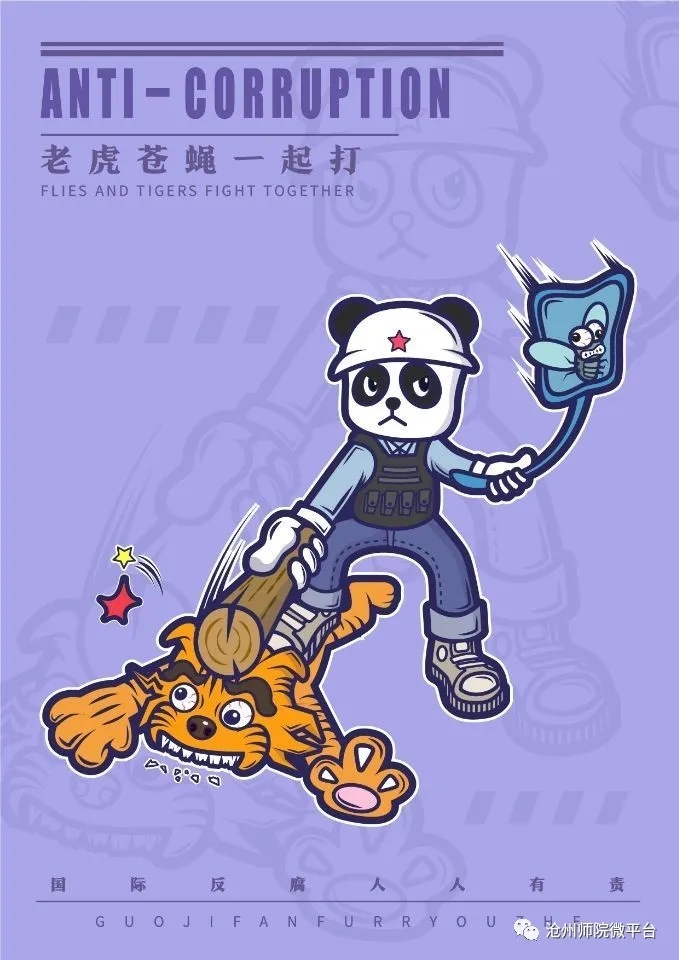 杨莹杰介绍作品时说:“看到反腐主题,首先想到的就是‘老虎苍蝇一起打’这句话,围绕这句话进行了直观形象的设计,一个熊猫警察一手棒打老虎,一手力拍苍蝇,直接明了地表达了作品立意,也展现了面对腐败,不论大小绝不留情的决心。”谈到参赛收获,他说:“参加比赛不仅学到了AI插画技术,还增加了实践动手能力。感谢学校和学院的信任支持,感谢指导老师郝小梅的悉心指导,也感谢王琦、韩序、许国超等老师课上专业知识的传授。今后我会更加有信心去创作更多作品参加各类比赛。”