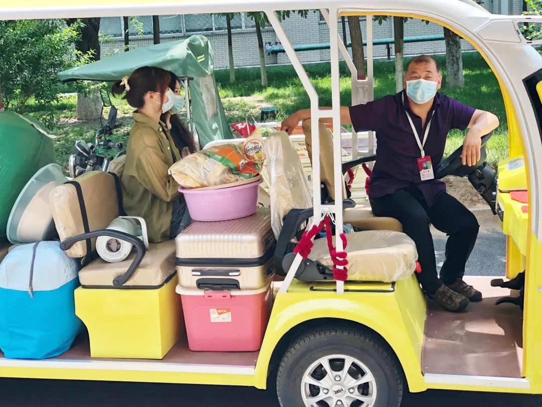 保洁叔叔和阿姨们也组成爱心团队,他们穿着统一的服装,往返于宿舍楼上楼下帮助学生们搬运行李。爱心车队满载着行李、承载着爱心,将学生们平安送出学校。