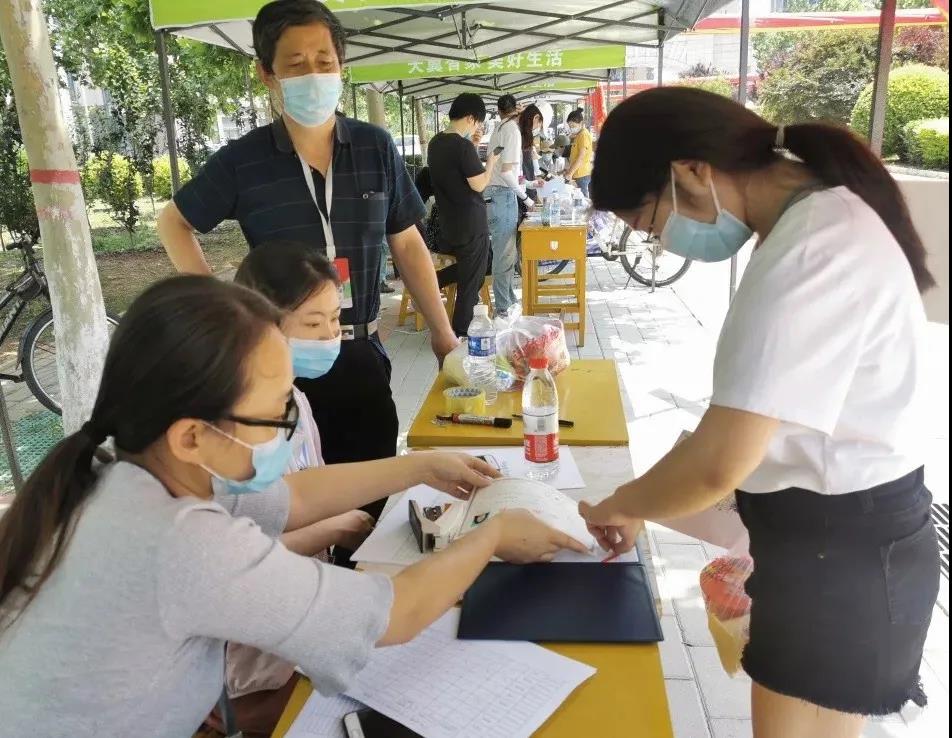 烈日下,负责毕业生相关手续的老师们在校门口忙碌着,收取个人体温健康记录表、实习材料、发放毕业证和学位证、贵重物品委托邮寄等,并向同学们发放爱心午餐。