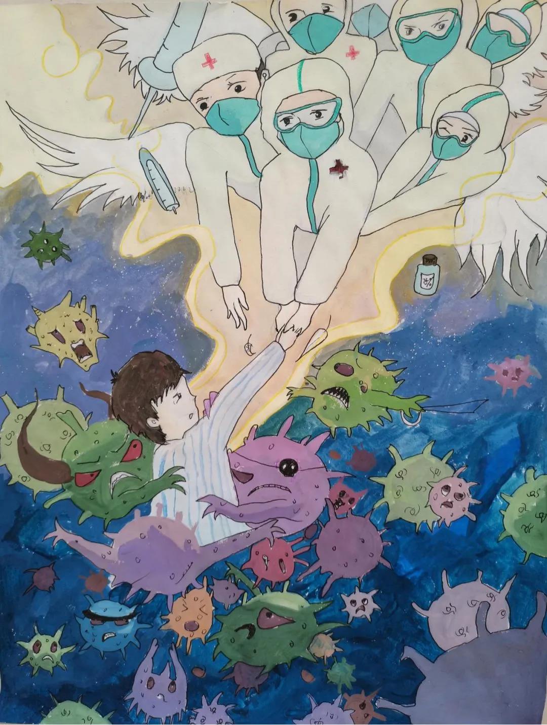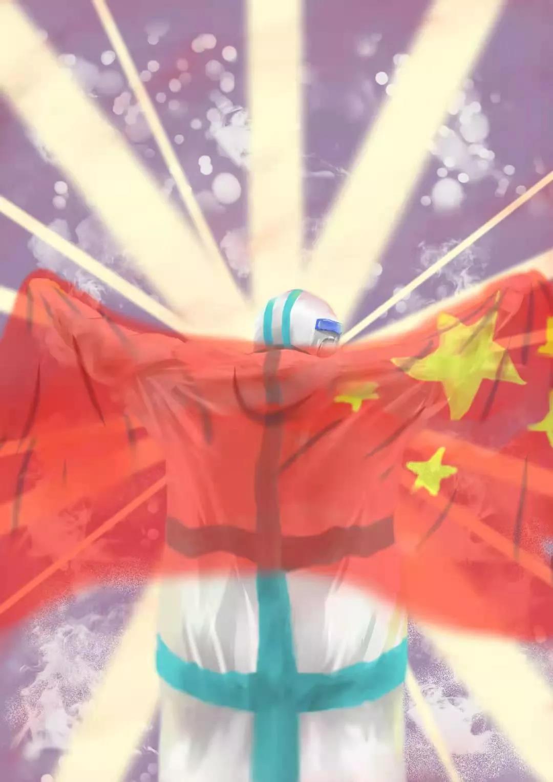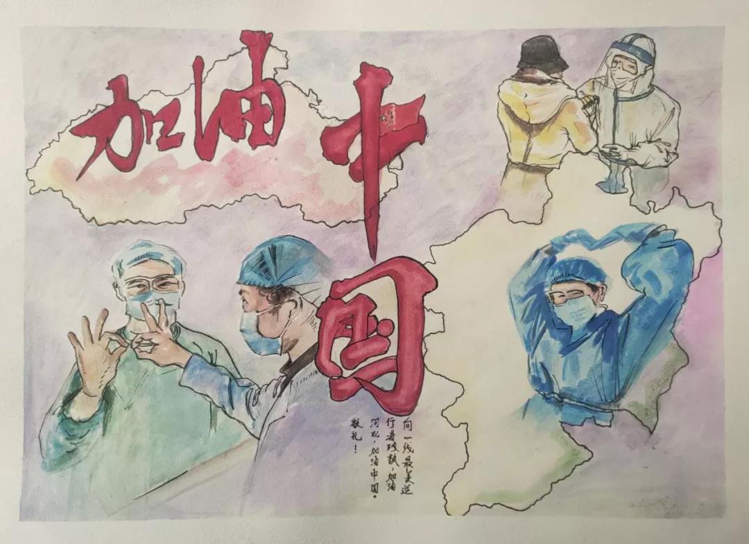 这幅作品我在画面中融入了石家庄和邢台的地图形状,我的家乡就在邢台,现在学校进行“同舟共‘冀’,砥砺前行”系列活动,号召我们为河北、为中国母亲以绘画的方式来表达我们抗疫的热情以及对“最美逆行者”深深的感谢,他们特别辛苦,虽然是冬天,但他们厚厚的防护服里还是积满了汗水,毫无抱怨的默默付出着。