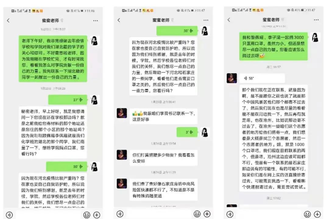 辅导员老师陈蜜蜜说:“当2016级湖北毕业生想要为母校抗疫出一份力,联系我时,我真的很感动。湖北学子彭雨婷一直说‘真的非常感谢去年湖北疫情严重时,学校和学院对我们湖北籍学子的关心和慰问,给我们送去口罩,提供补助,帮助我们度过了那段艰难的日子,现在河北出现疫情,我们也想为学校贡献一点力量,捐赠一些口罩’在学院陈树旺书记及崔维真院长的沟通安排下,我们联系了我院抗疫志愿者,为他们送去师姐们带来的关怀!这正是我们作为教育工作者最希望看到的样子——有责任心、担当有为、懂得感恩,希望化院学子能够延续这份爱心,传承化院精神,担起新时代青年的使命与担当。也祝愿化院毕业生前程似锦,一切顺遂!”