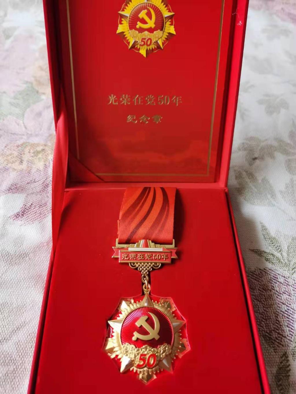 一进家门,看到奶奶欢欣雀跃的面庞,我还真是好奇,是什么礼物让老太太这么兴奋呢。奶奶一马当先走进卧室,小心翼翼地拿起一个盒子,献宝一般托到我面前,“上午街道让我去取的,只有在党50年以上的党员才能有呢!”奶奶满是皱纹的脸上出现了孩童般自豪骄傲的神情,我打开一看,是一枚做工精美,熠熠生辉的纪念章,党徽之下,“50”的图案格外显眼。