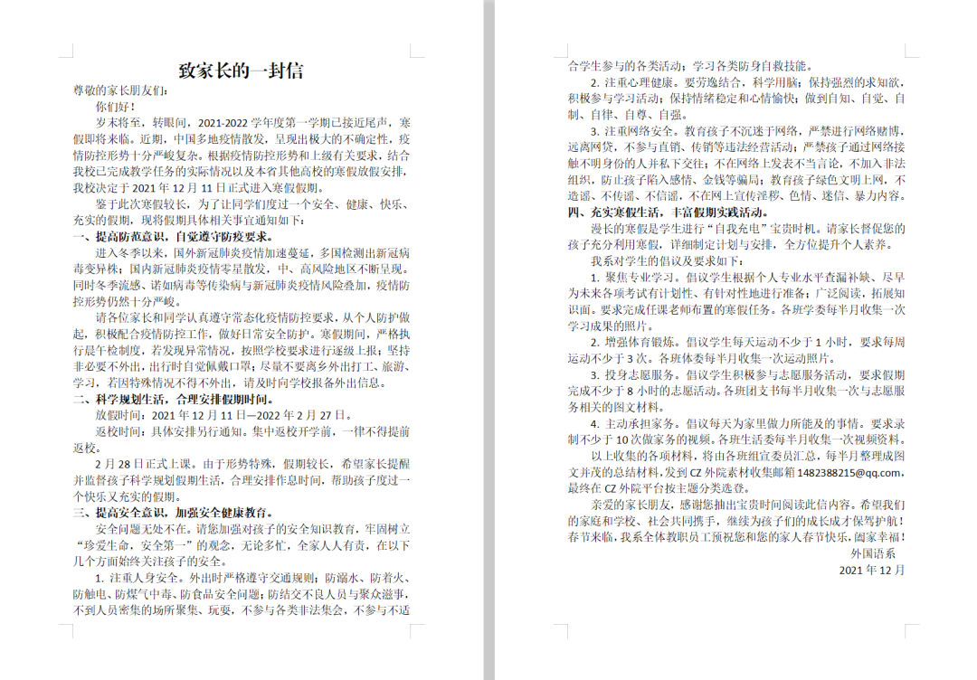 外国语学院按照校党委要求,以“致家长一封信”的形式,向学生家长详细介绍了疫情防控要求、假期安排、注意事项等内容,对学生和家长均起到了警示作用。此外学院还发起了与家人合影的活动,确保学生安全到家,感受家庭温暖。