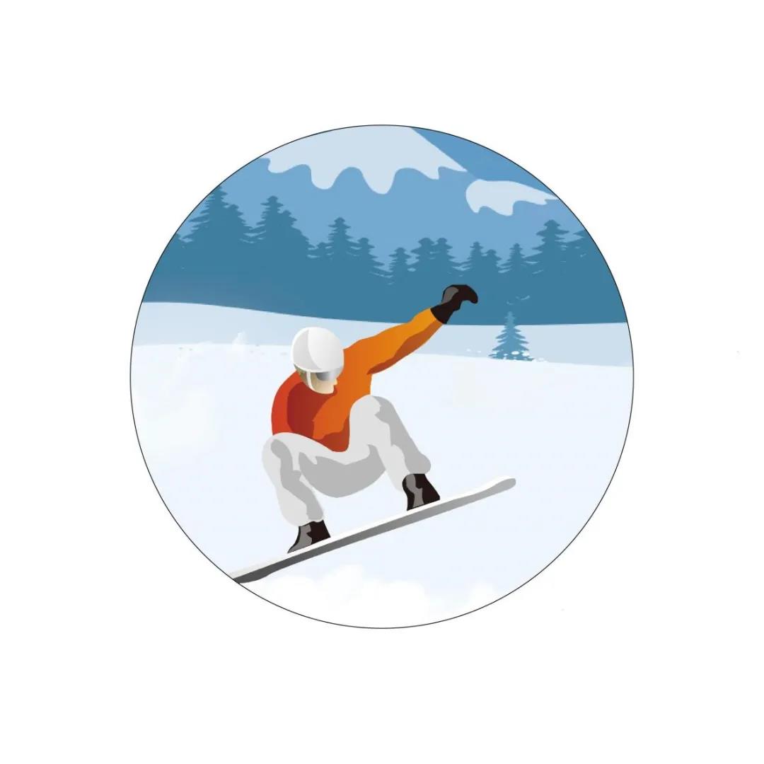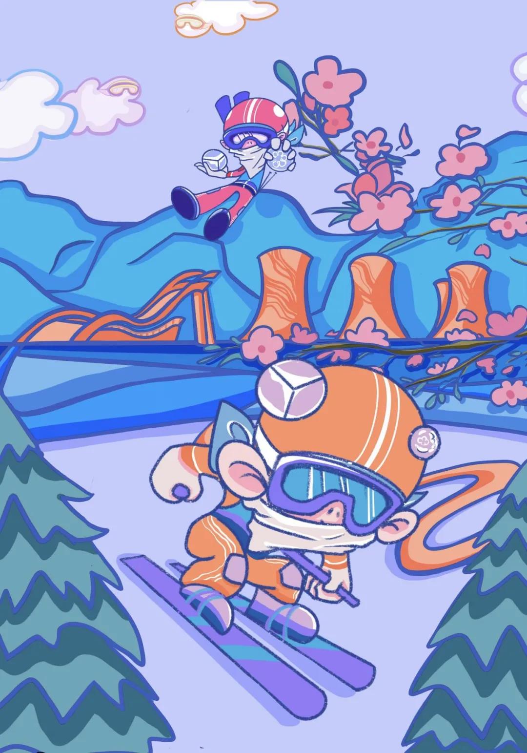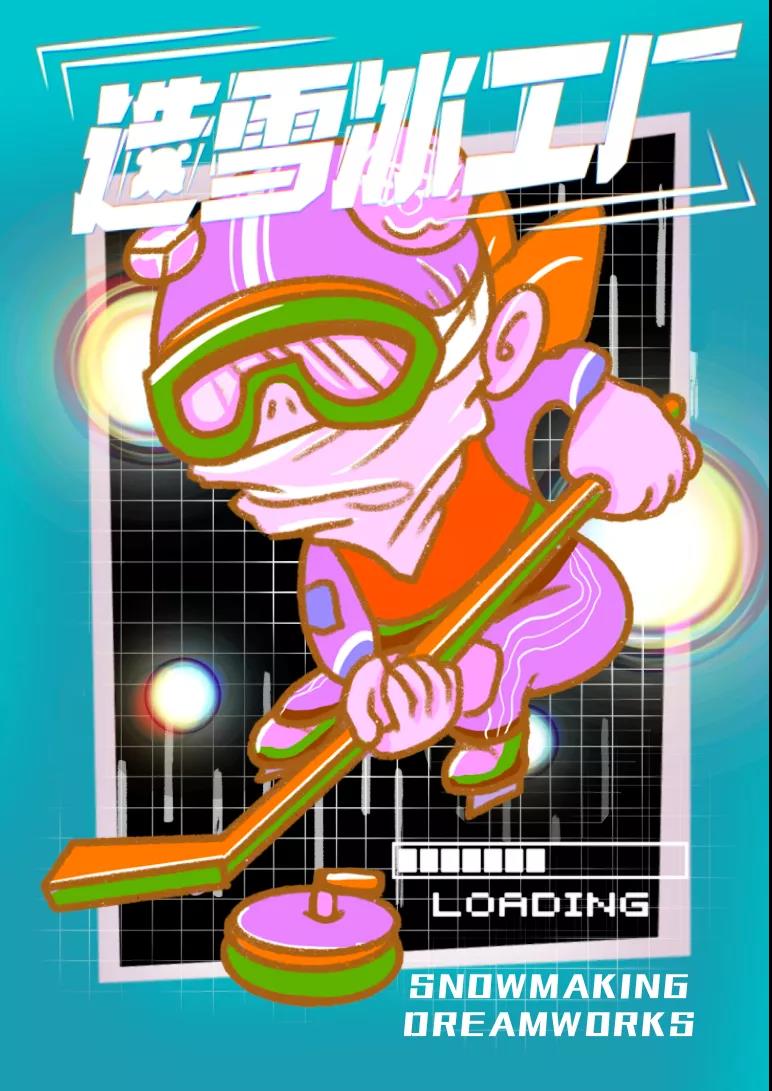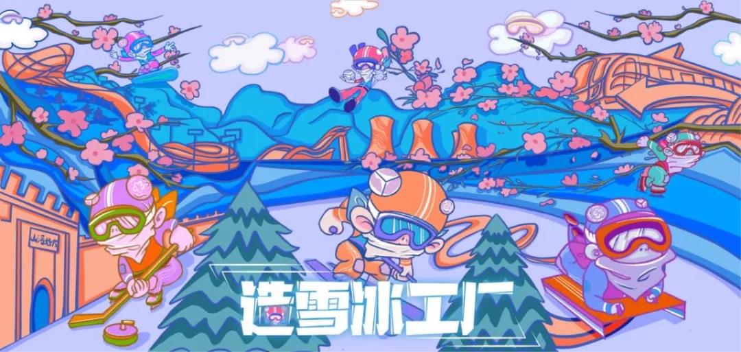 造雪冰工厂的设计灵感来源于2022年北京冬奥会,插画中的主人物是运用冬奥会运动员滑雪服的外形进行卡通化形象设计,本着审美与实用相统一的原则,尽量使线条,形态清晰明快,制作方便,生动形象地表达了冬奥会中的各种冰雪项目。