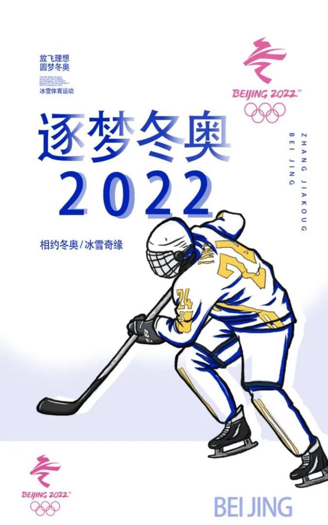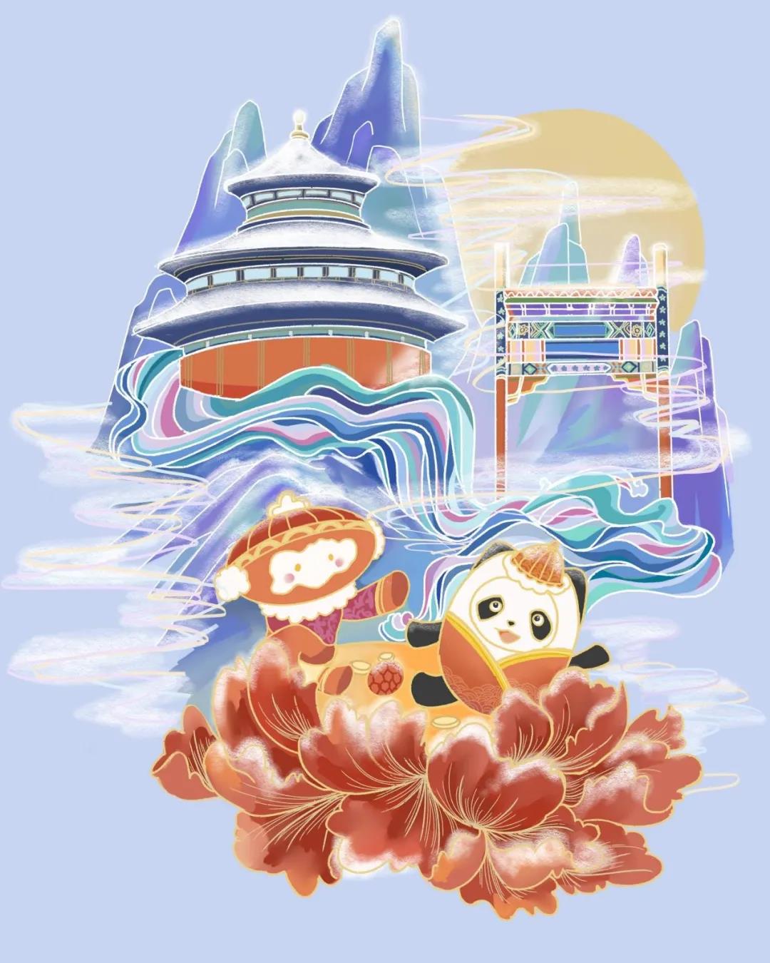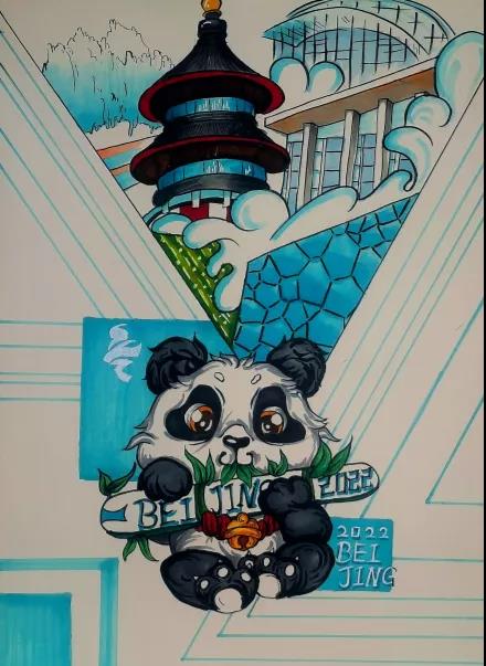作品以蓝色为主色调,视觉中心外的地方用蓝色的线条与留白做填充,同时作品中添入了许多中国元素,如熊猫、天坛、首都体育馆、水立方游泳馆等,在传承奥林匹克精神的同时,充分将其与中国文化进行了动感、现代的融合,同时也祝愿2022年北京冬奥会圆满成功,希望每一位运动员们在赛场上取得好成绩。