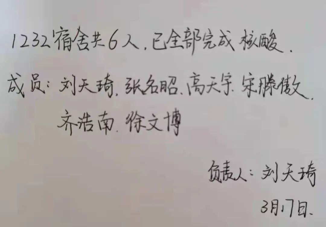 为保证核酸检测应检尽检,丁咚老师在自己所辖年级建立以宿舍为单位的核酸检测包联上报体系,每天叮嘱宿舍包联人要确保宿舍所有成员按时完成核酸检测,并仔细核查由宿舍包联人通过微信小程序上传的核酸检测完成情况的图片。丁咚老师立足使命,加强监督,助力疫情防控工作顺利推进。