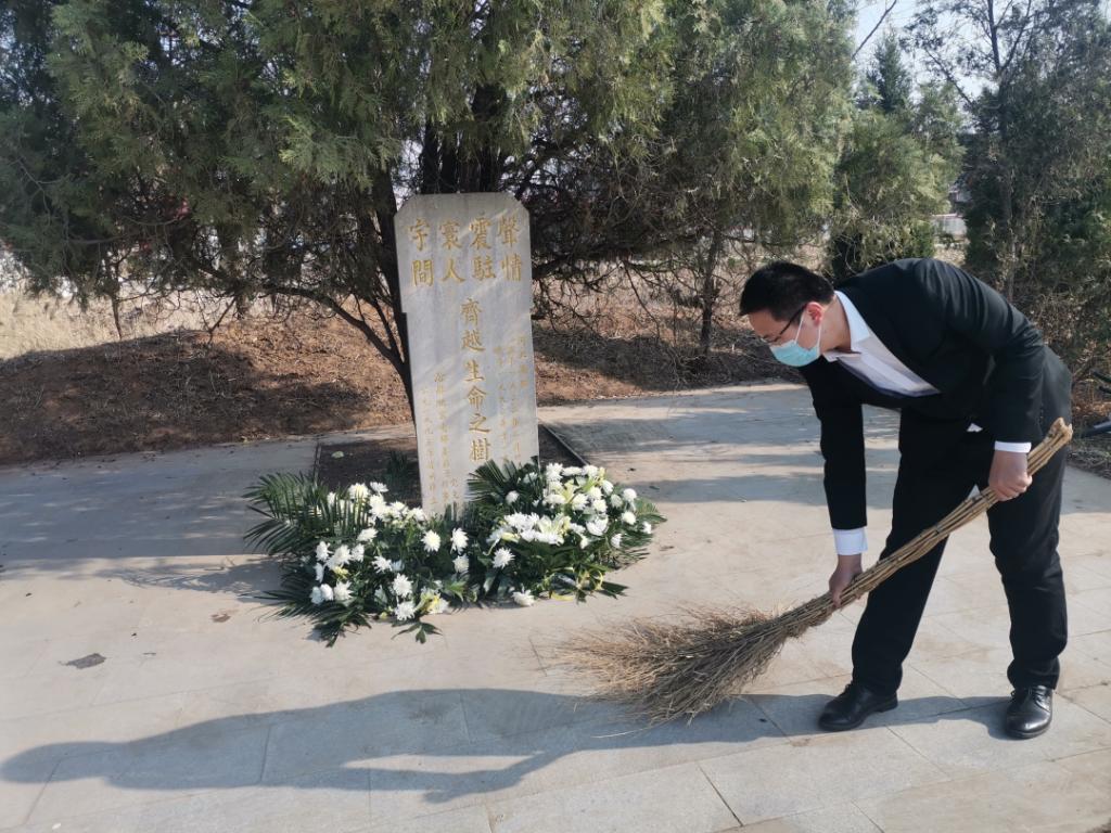 师生们怀着无比崇敬的心情,在这里举行庄严仪式。扫墓活动开始,贾溥畅老师和邢禹岙老师敬献花篮。