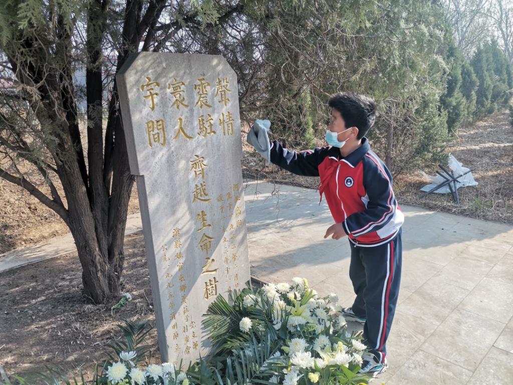 同学们清洁墓碑,打扫两侧过道,随后绕墓碑一周,逐一献上自己亲手制作的小白花。