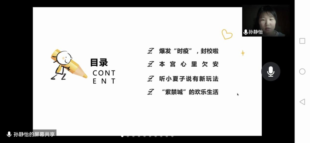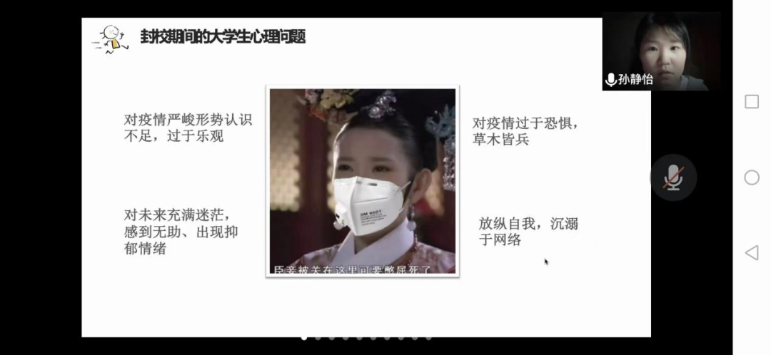 讲座中孙静怡老师结合了辅导员工作中的丰富实际的案例和经验分享,内容翔实接地气,同时精心制作了多个贴近的小视频。孙静怡在讲座中提到:“在面对突然压力时,我们首先要坚定信心,正视疫情,服从规定;其次要保持乐观的心态;再次,一定要保持规律作息,保持适度运动,保持人际交往关系,不忘记自己作为学生学习的天职,完成学习计划,充实自己的时间;最后,问题较为严重时,一定及时寻求专业心理专家老师的帮助。”