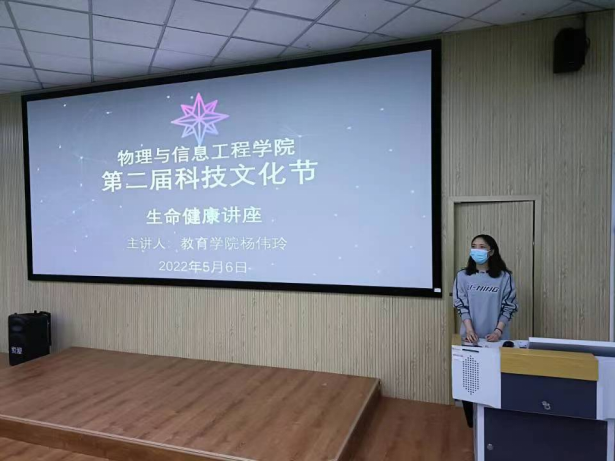 5月6日举办“生命健康讲座”,帮助同学积极应对学习压力,健康快乐地度过美好的大学时光。主讲人为教育学院杨伟玲老师,杨老师毕业于河北师范大学,主修心理健康教育,辅修教育学基础理论知识。
