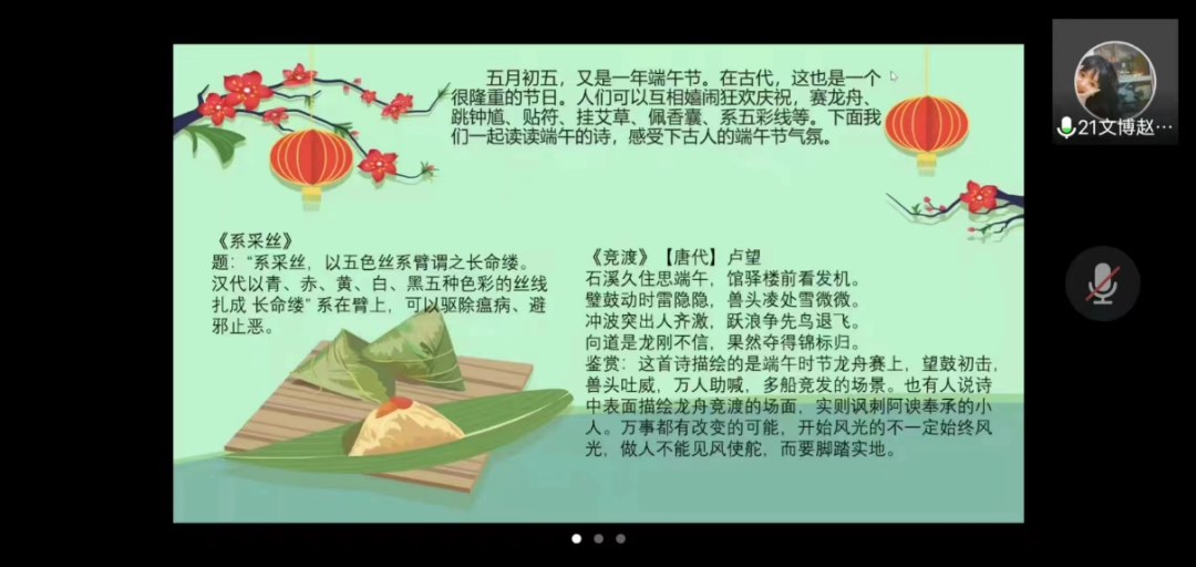 5月22日,学院组织开展了“一粽浓情,一粽乡愁”主题教育活动。大家积极参与,通过观看视频、展示各地有关端午节的活动、分享有关端午的古诗句使大家感受到了端午节的魅力,培养大家对优秀传统文化的兴趣和喜爱,弘扬民族精神,更好地宣传和推广中华民族优秀传统文化,增加民族自豪感和自信心。