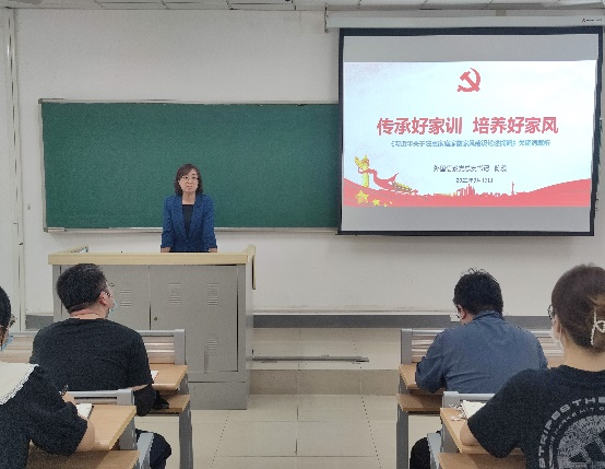 9月13日,外国语学院党总支书记陈蕊以“传承好家训,培养好家风”为主题面向师生党员讲党课。她深入解读了《习近平关于注重家庭家教家风建设论述摘编》中的25个关键词,重点强调了家庭教育同社会主义核心价值观的紧密结合,鼓励师生要正确处理好家庭中情感与道德、法治的关系,将宿舍比喻为一个小的家庭,倡导宿舍成员之间要互相理解、积极沟通。此次党课,对师生传承和弘扬中华传统优良家风具有积极意义。