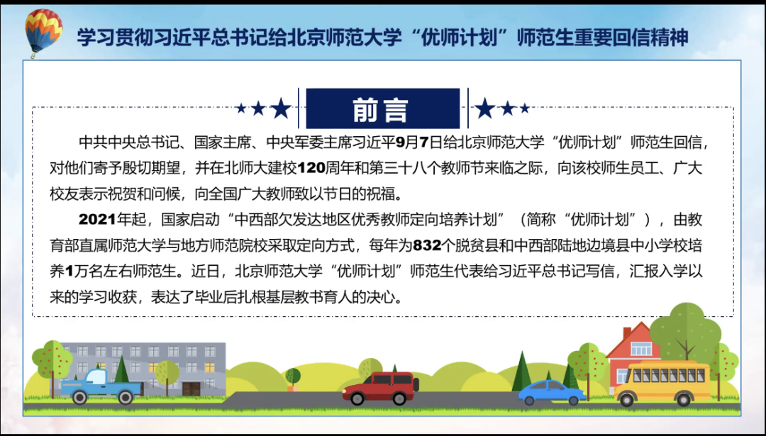 辅导员老师结合教育部党组对学习贯彻习近平总书记给北京师范大学“优师计划”师范生的重要回信精神的四项部署,即“加强中国特色教师教育体系建设;推进高素质专业化创新型教师队伍建设;促进教师资源均衡配;出台利师惠师举措”,领学了回信的内容,并结合伟德实际对“优师计划”以及国家对教师队伍建设的最新举措进行了介绍,对同学们未来的职业规划进行指导。
