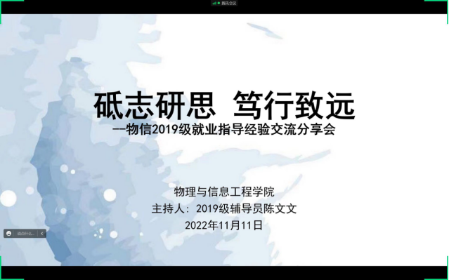 为充分发挥毕业生就业典型的引领示范作用,引导在校学生做好学业规划和求职准备,促进学生高质量就业,近日,物理与信息工程学院于线上召开“2019级就业指导与经验交流分享会”。该院党总支副书记黄晓寸、团总支书记陈文文以及2019级全体同学参加。
