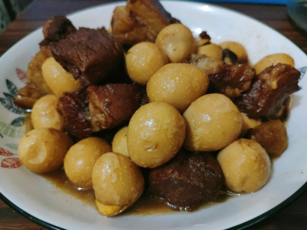 鹌鹑蛋作为这道菜的配料,也含有丰富的营养价值。它的铁、核黄素、维生素A等含量比同量鸡蛋高出两倍左右,而胆固醇则比鸡蛋低很多。所以鹌鹑蛋是体虚病弱者、老人、儿童及孕妇的滋补佳品。在做饭期间我掌握了一些小技巧:用水油法炒糖色不容易糊,若上色均匀的话可以不用加老抽,只用生抽调味即可;煮熟的鹌鹑蛋用牙签浅浅扎几下更容易入味,但不要煮太久,质感柔软更好吃。经过妈妈的指导,我的鹌鹑蛋烧肉顺利制作完成,同时也获得了家人的一致好评。