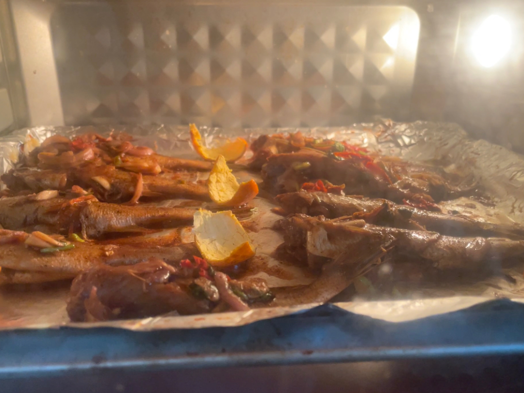 烤鱼不仅美味,同时我们也可以享受到鱼肉中含有的蛋白质、维生素和钙、磷、铁等多种营养元素,其中丰富的卵磷脂对于健脑有很大益处,适当食用可以在补充营养的同时起到补脑、增强记忆力的效果。在制作时我们首先需要将鱼清理干净开花刀,配料切末备用;接着将所需的调味料均匀地抹在鱼身上腌制半小时,这一步十分重要;最后鱼面抹油放入烤箱,200摄氏度烤23分钟即可完成。