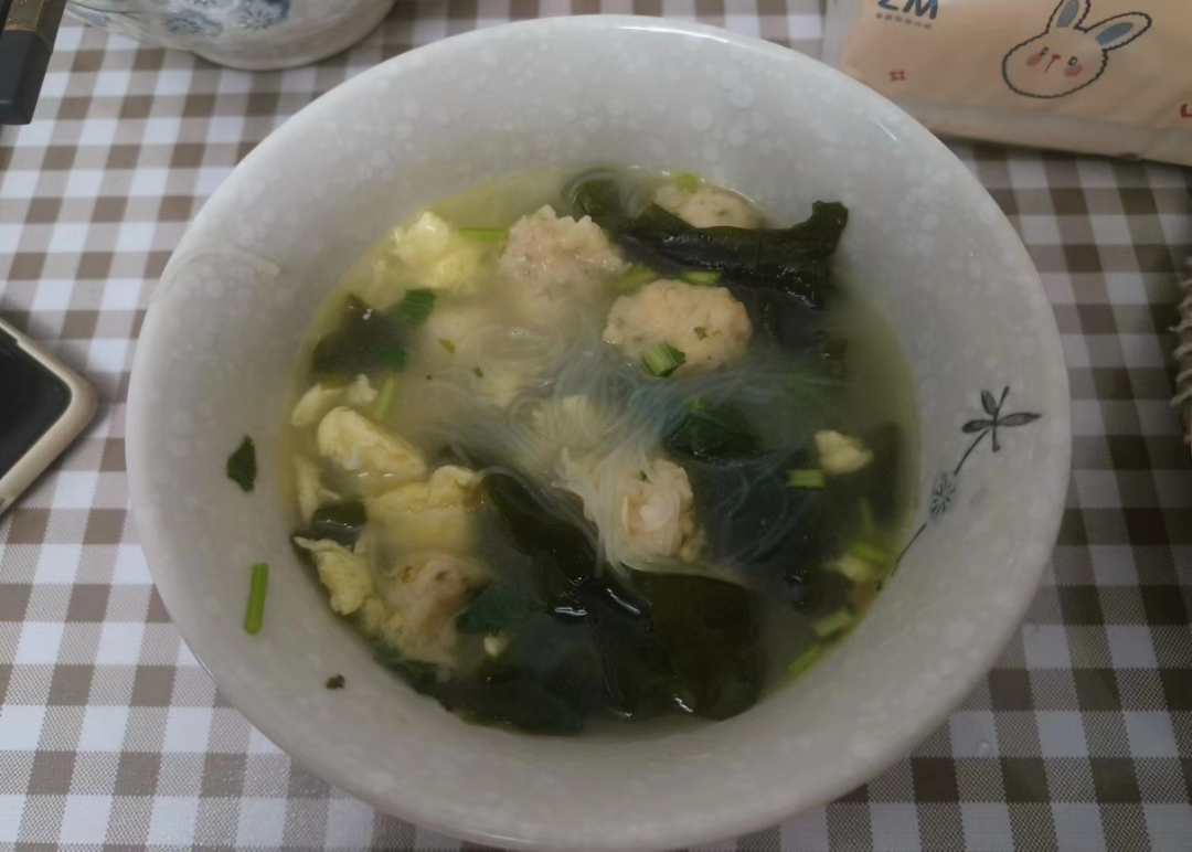 裙带菜营养丰富,食用价值较高,被誉为“海中蔬菜”,经常食用可提高人体的免疫功能,促进脂肪代谢。且肉质易消化、富含高蛋白的虾丸是老少皆宜的营养佳品,也是身体虚弱的病人用来调理的优质食物。在做这道菜的过程中我了解到,做汤时裙带菜用冷水泡5分钟或者用热水泡30秒即可,如果是新鲜的裙带菜洗一下就可以煮了,不需要泡水,这样做出来的汤味道会更鲜美。