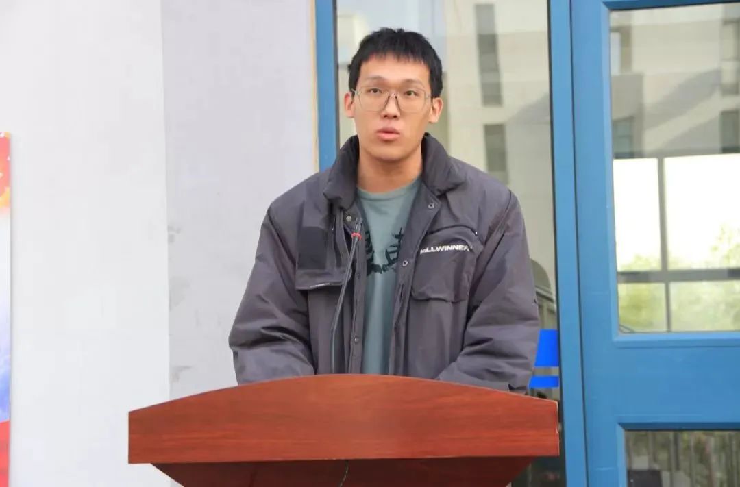 优秀获奖学生代表何家宝发言。他感谢学院领导、老师们的支持与鼓励,并分享自己参赛经历和赛后心得,号召大家树立目标、共同进步、创先争优。