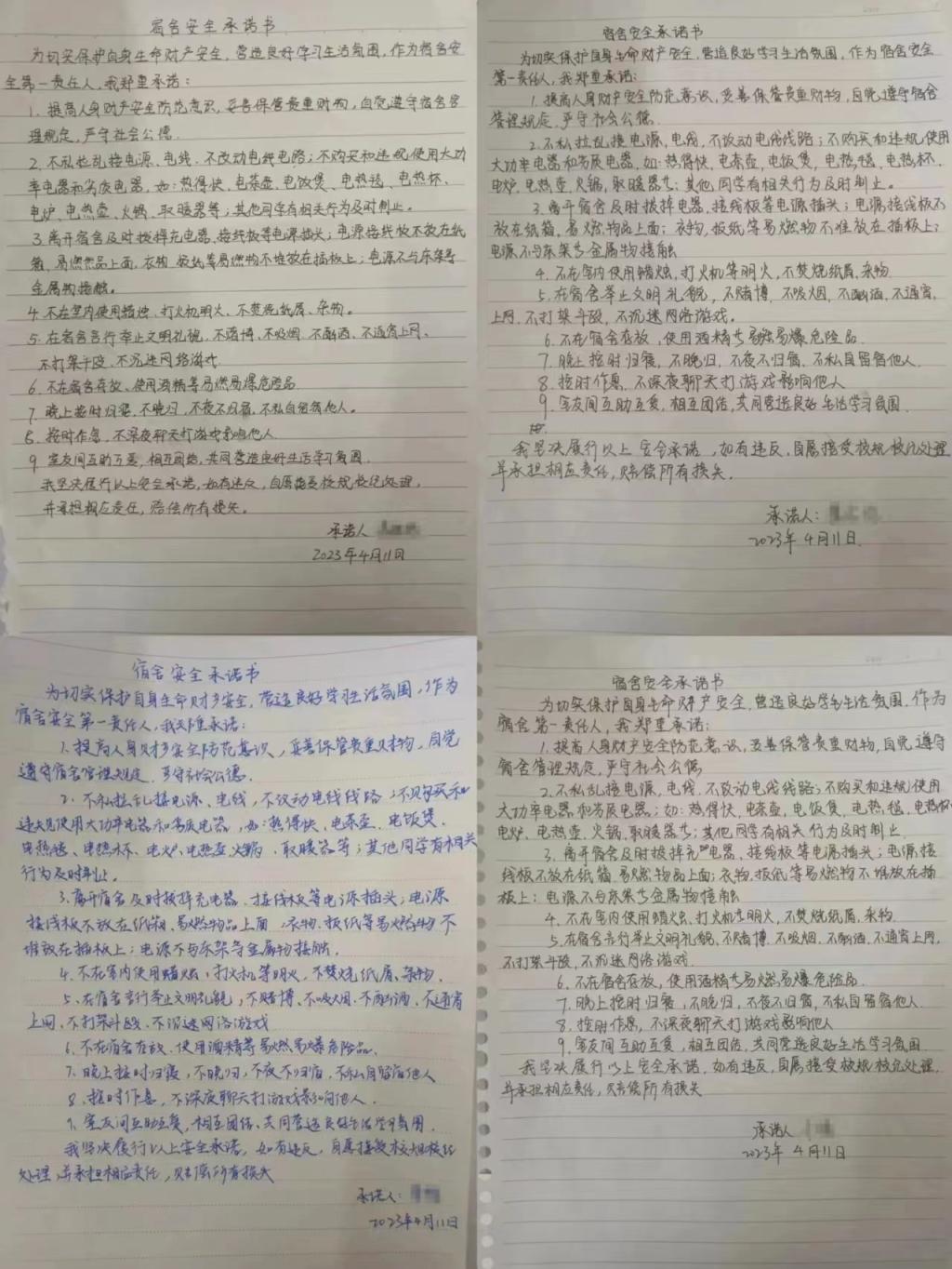 班会结束后,同学们手写签署“宿舍安全承诺书”,承诺作为宿舍安全第一责任人,一定严格遵守各项相关规定,争创安全文明宿舍。
