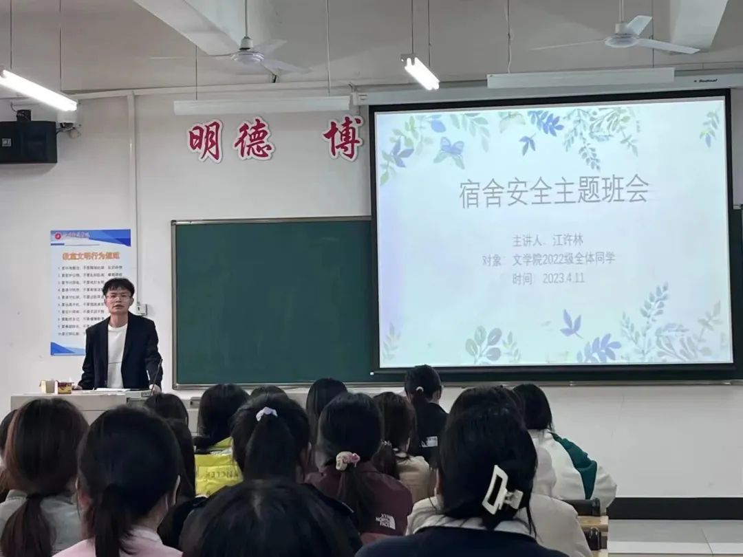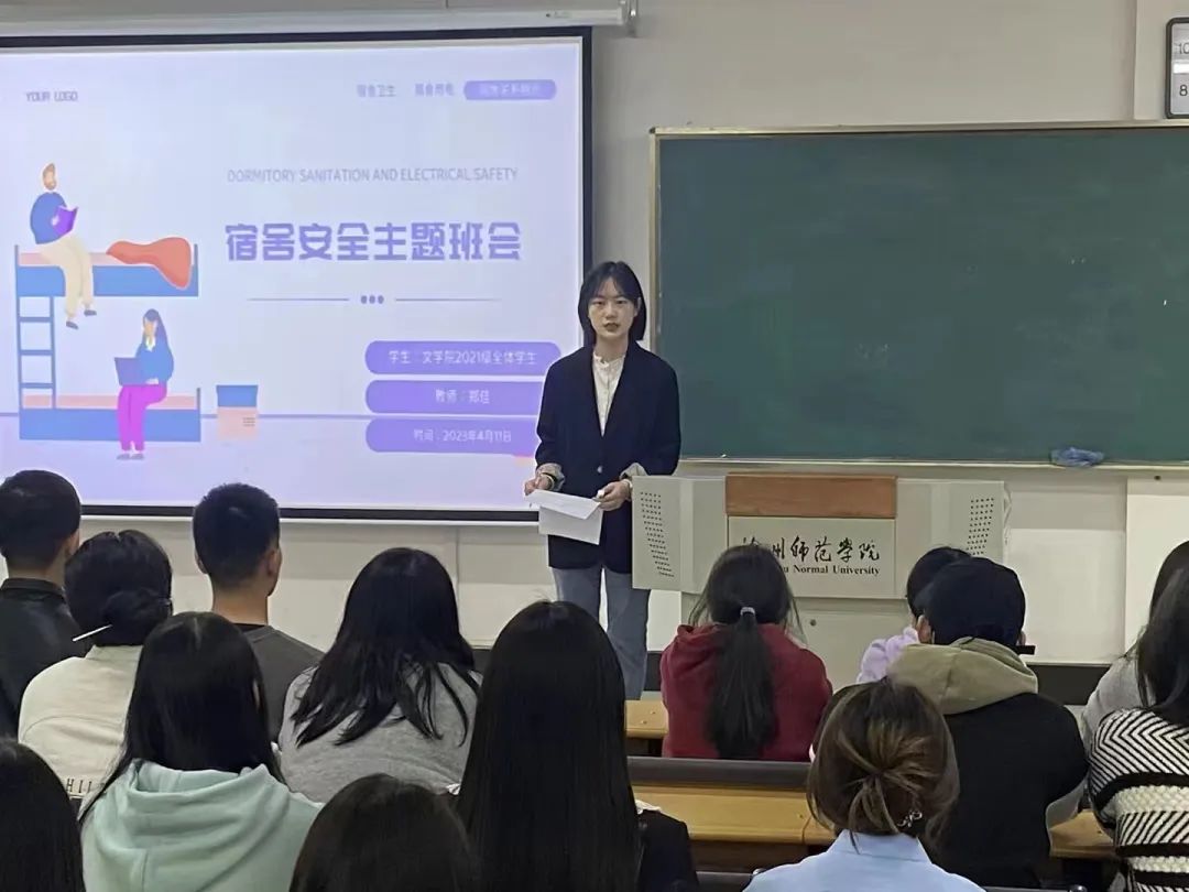 文学院辅导员组织全体学生召开“宿舍安全主题班会”,从财产安全、用电安全、人身安全等方面对相关注意事项展开详细讲解,通过组织观看“宿舍消防安全警示案例”视频,提醒同学们从小事做起、从细节做起,将安全用电记在心间、落到实处。