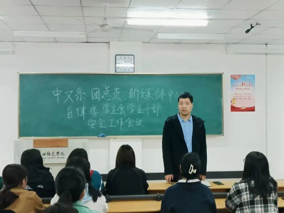 文学院团总支书记孙玉安召开学生干部安全工作会议,他表示,学生干部要切实做好安全防范工作,为学院树立良好形象,为同学们做好表率作用,同时加强学生会安全监督部一日常规巡查的工作力度,做好排查工作,及时发现隐患,增强责任感和安全意识,确保学院安全稳定。