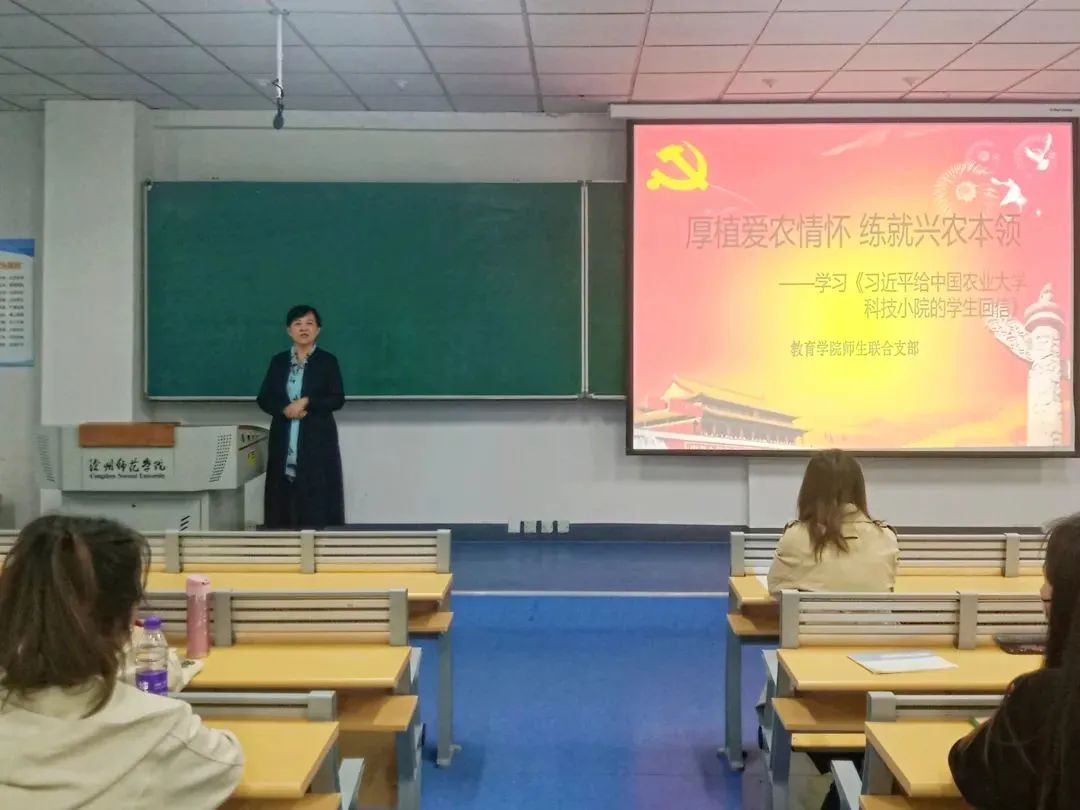 金晓雪强调,要将习近平总书记回信精神的深刻内涵与日常学习、工作融会贯通,要把课堂学习和社会实践紧密结合起来,做到认真学习、脚踏实地,毕业后到祖国和人民最需要的地方去,努力成为党和人民满意的“四有”好老师,将奋斗的青春力量注入乡村振兴和农业农村现代化建设中,为实现乡村教育发展而不懈奋斗。