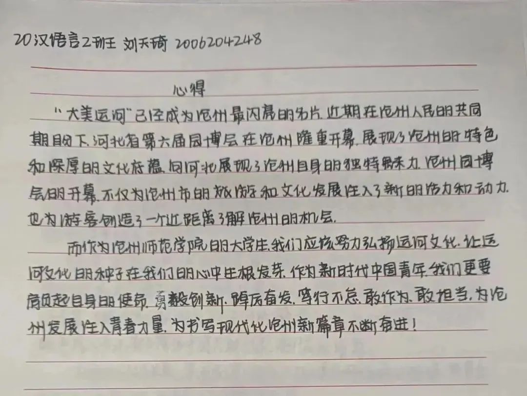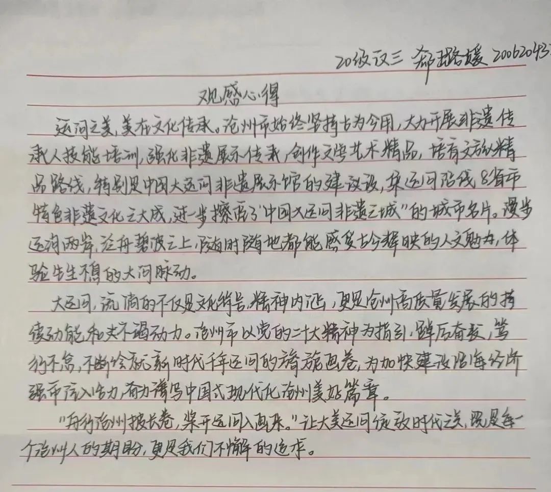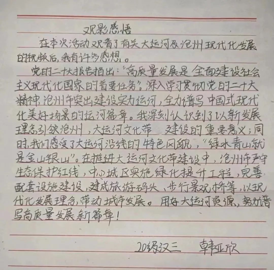 活动激发了同学们的历史使命感和时代责任感。参与活动的学生表示,将牢记党对青年的期望与嘱托,坚定不移沿着习近平总书记指引的方向奋勇前进,传承和发扬大运河文化,以顽强的毅力和进取的精神,共同谱写中国式现代化沧州美好篇章。