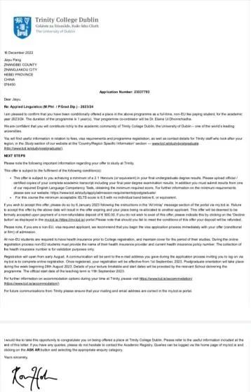 2023届庞嘉宇录取为都柏林圣三一大学应用语言学方向研究生