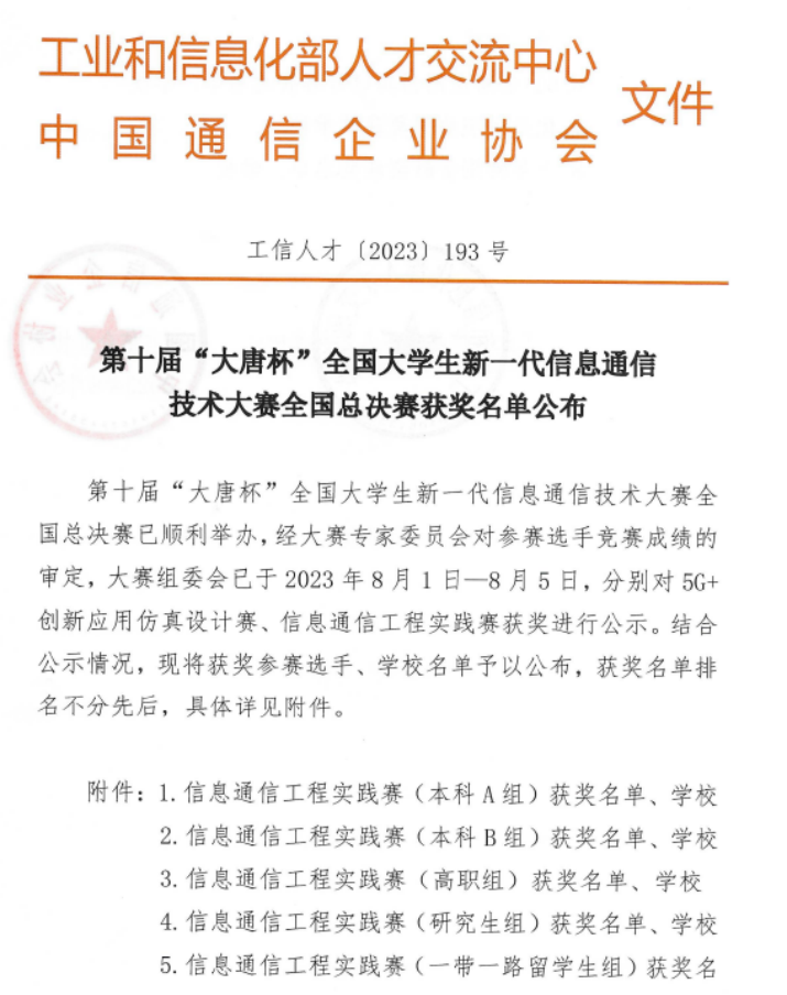 7月15日,为期两天的由工业和信息化部人才交流中心和中国通信协会主办,中信科移动通信公司承办的第十届“大唐杯”全国大学生新一代信息通信技术大赛全国总决赛在北方工业大学成功落幕。由伟德物理与信息工程学院潘枳帆、汲震东两名同学组成的参赛团队经过层层选拔,获得了国赛二等奖的佳绩。