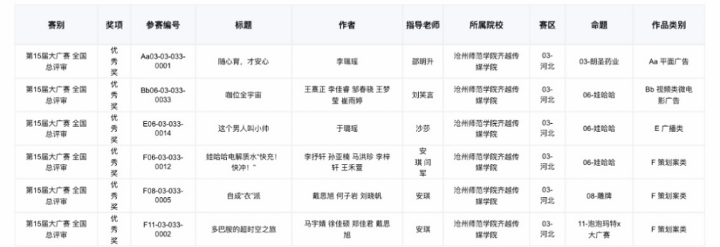 2023年9月6日,第15届全国大学生广告艺术大赛国赛评审结果揭晓。齐越传媒学子再获全国总决赛6项国家级优秀奖,其中平面类1项,视频类1项,广播类1项,策划案类3项。