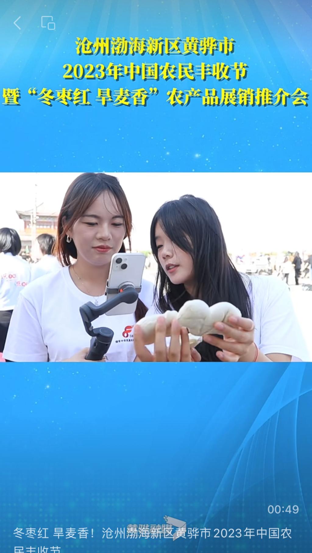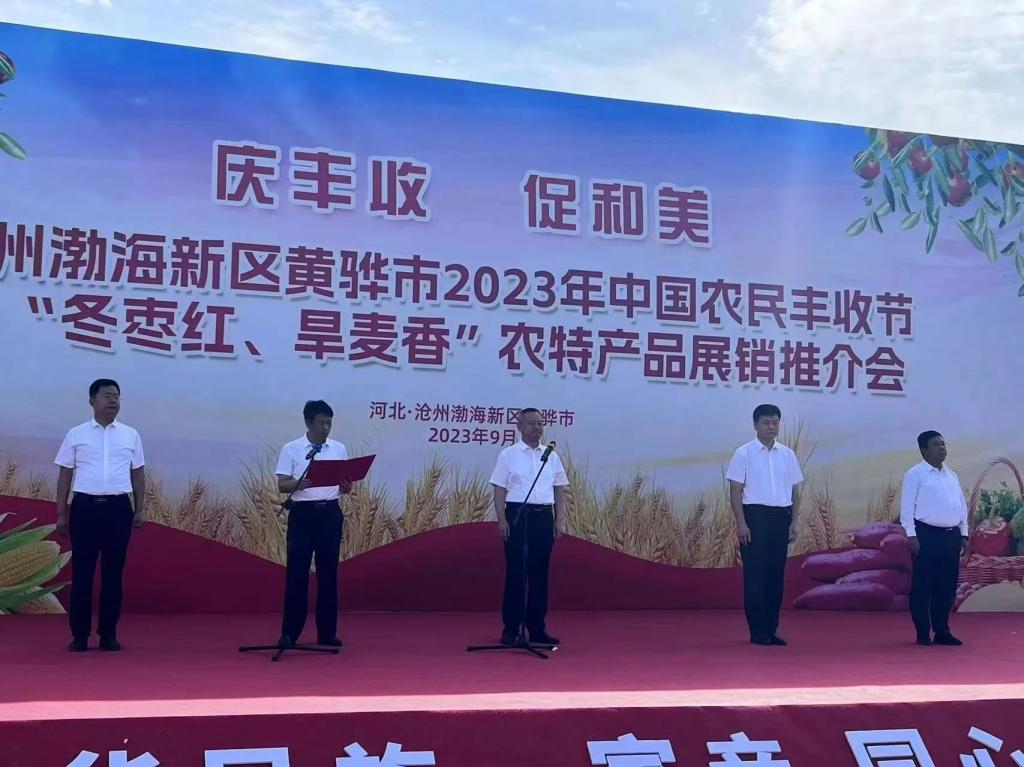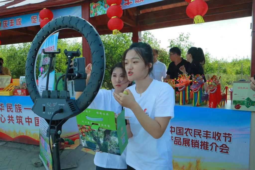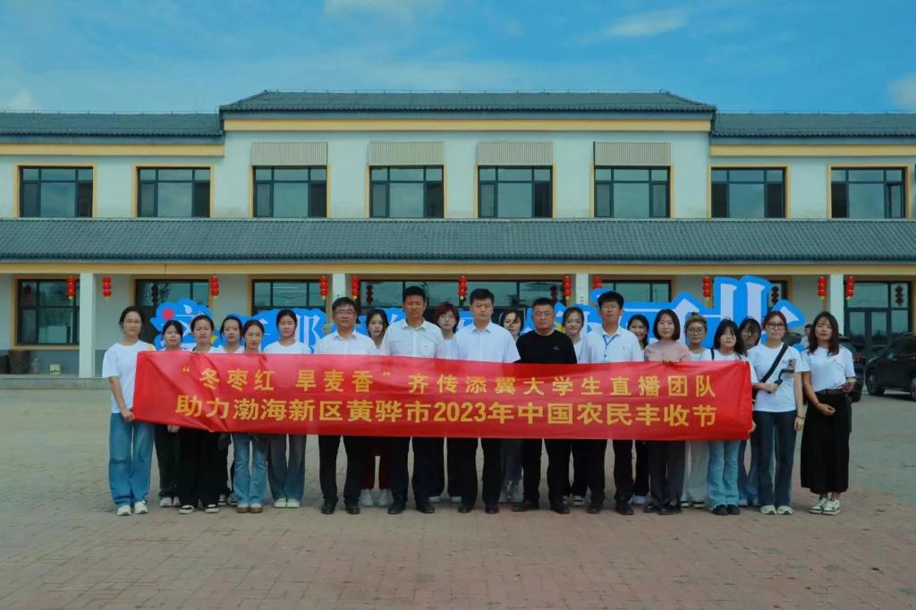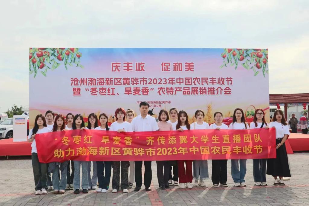 庆丰收,促和美,9月23日,渤海新区黄骅市2023年中国农民丰收节暨“冬枣红、旱麦香”黄骅农特产品展销推介会盛大开幕,齐越传媒学院党总支书记潘治钢,教师郭晓月带领“齐传添翼”直播团队成员到齐家务聚馆古贡枣园参加本次活动。