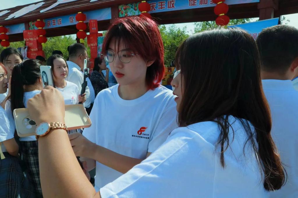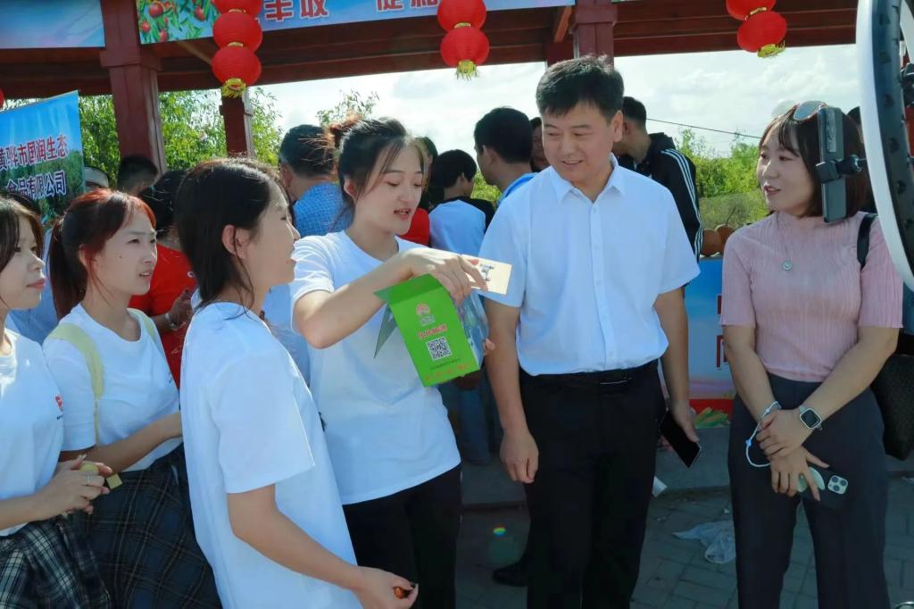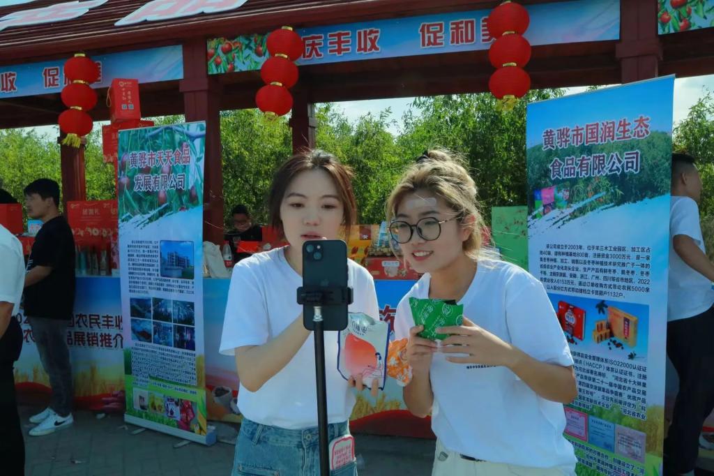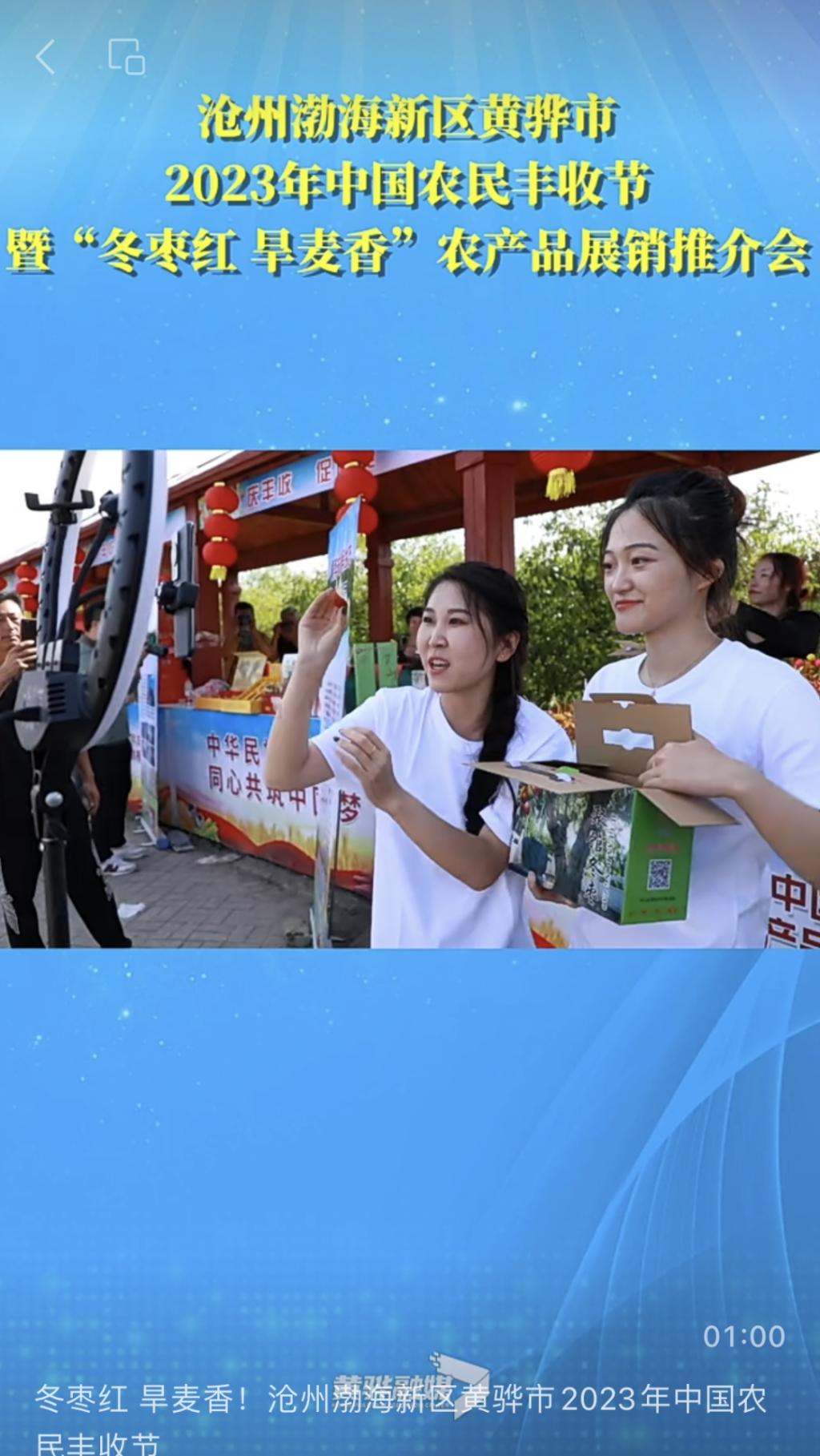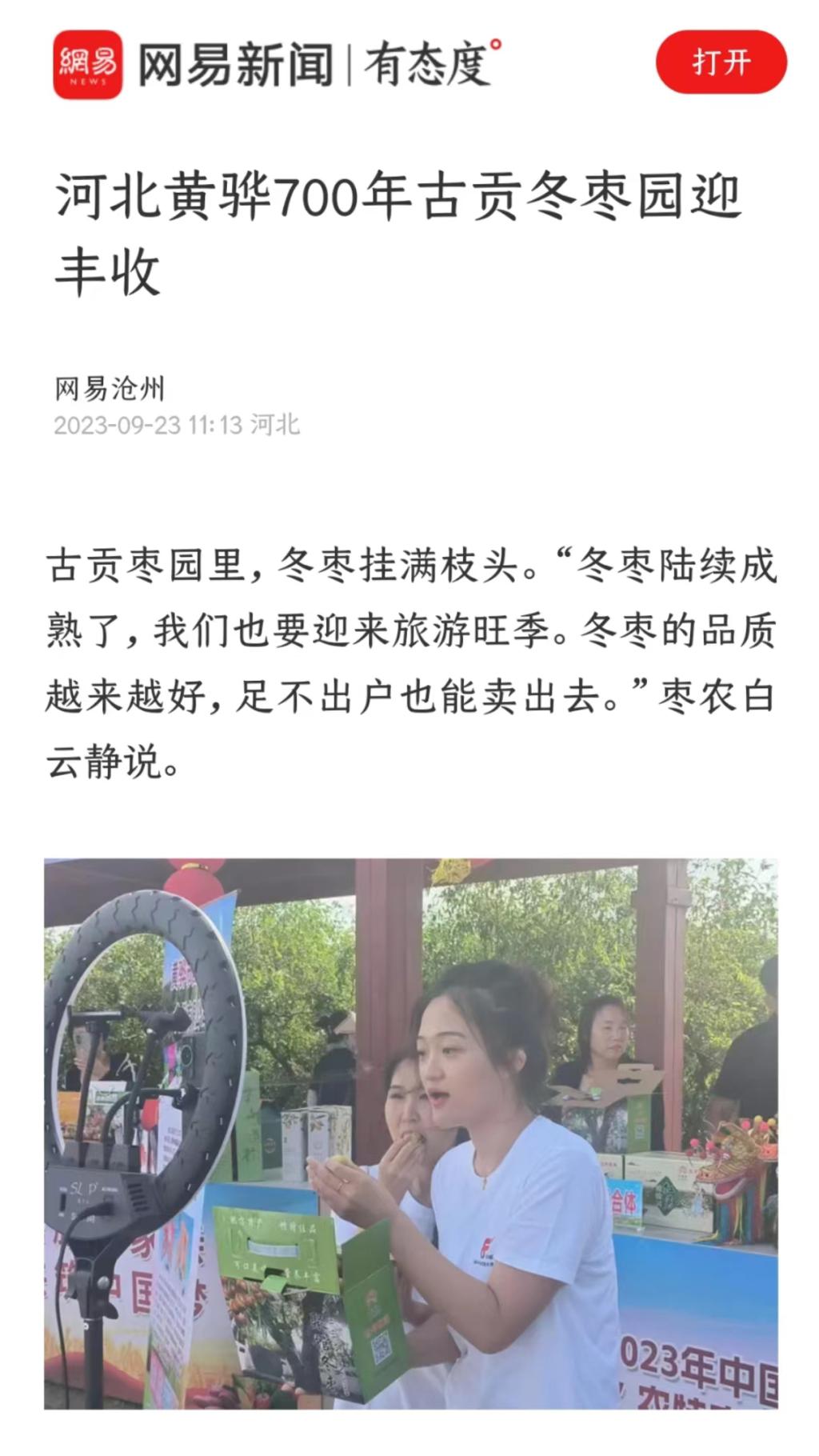 庆丰收,促和美,9月23日,渤海新区黄骅市2023年中国农民丰收节暨“冬枣红、旱麦香”黄骅农特产品展销推介会盛大开幕,齐越传媒学院党总支书记潘治钢,教师郭晓月带领“齐传添翼”直播团队成员到齐家务聚馆古贡枣园参加本次活动。