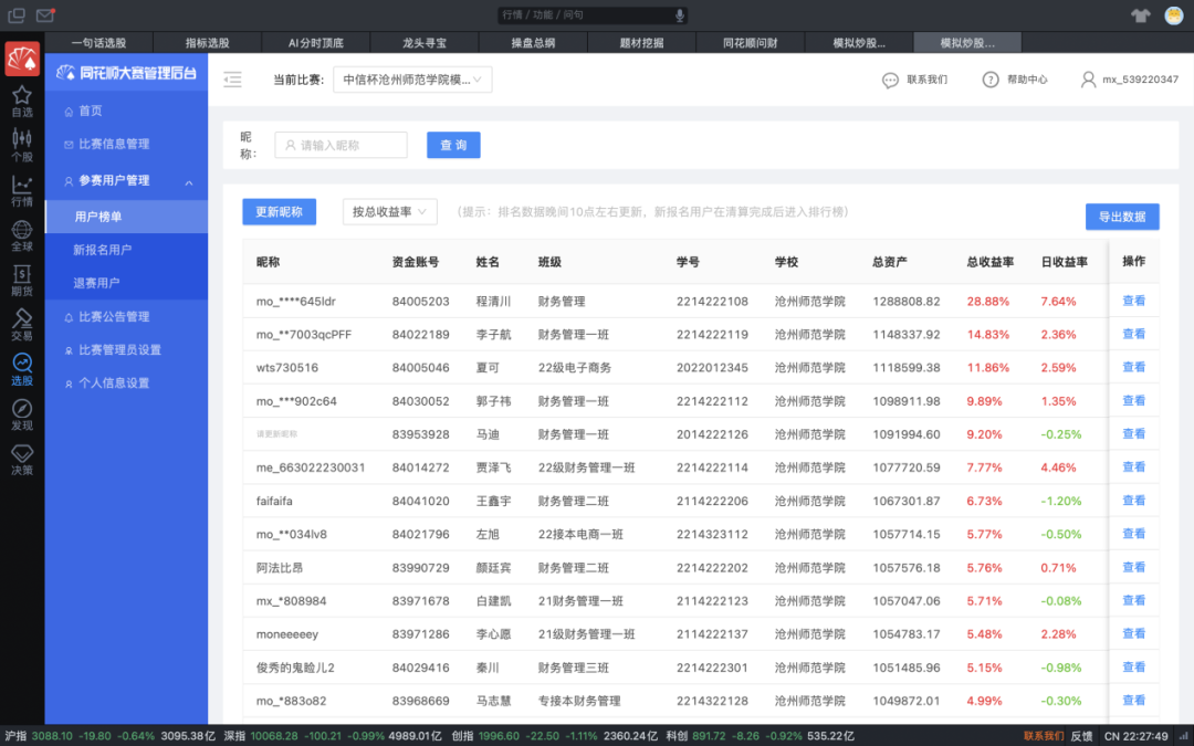 经济管理学院秉承“专业与产业结合,学历与能力对接”的理念,积极探索“以赛带训、以赛促学、以赛促教”实训模式助力应用型专业人才的培养,联合中信银行沧州分行举办首届模拟投资大赛。比赛采用同花顺 app 进行模拟交易,每个参赛账号提供虚拟资金100万进行模拟投资,所有选手在大赛最后一个交易日结束后提交投资收益报告,最终比赛排名由两部分构成,模拟投资收益率排名占80%,投资收益报告内容占20%.