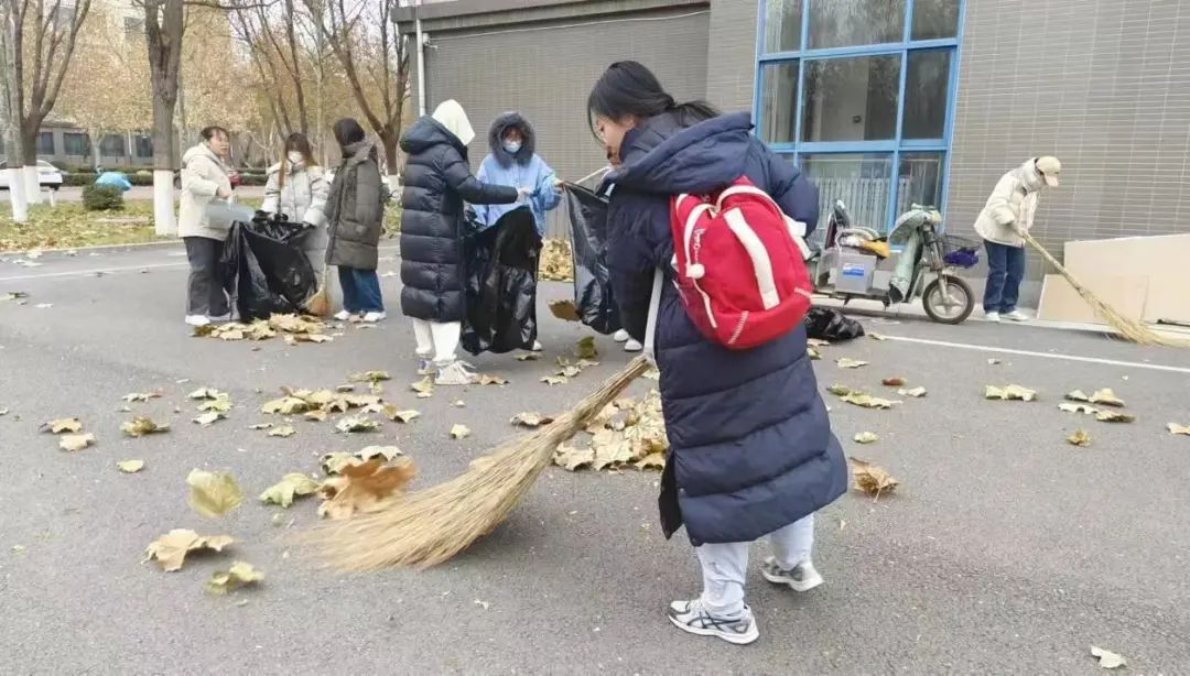根据实践任务的需要,同学们分成了若干小组,他们拿着扫帚和簸箕,认真地清扫着每一个角落,细心地扫去落叶、纸屑、垃圾。大家不畏严寒,齐心协力,配合默契,忙碌的身影充满了活力与热情,构成了校园内一道亮丽的风景线。