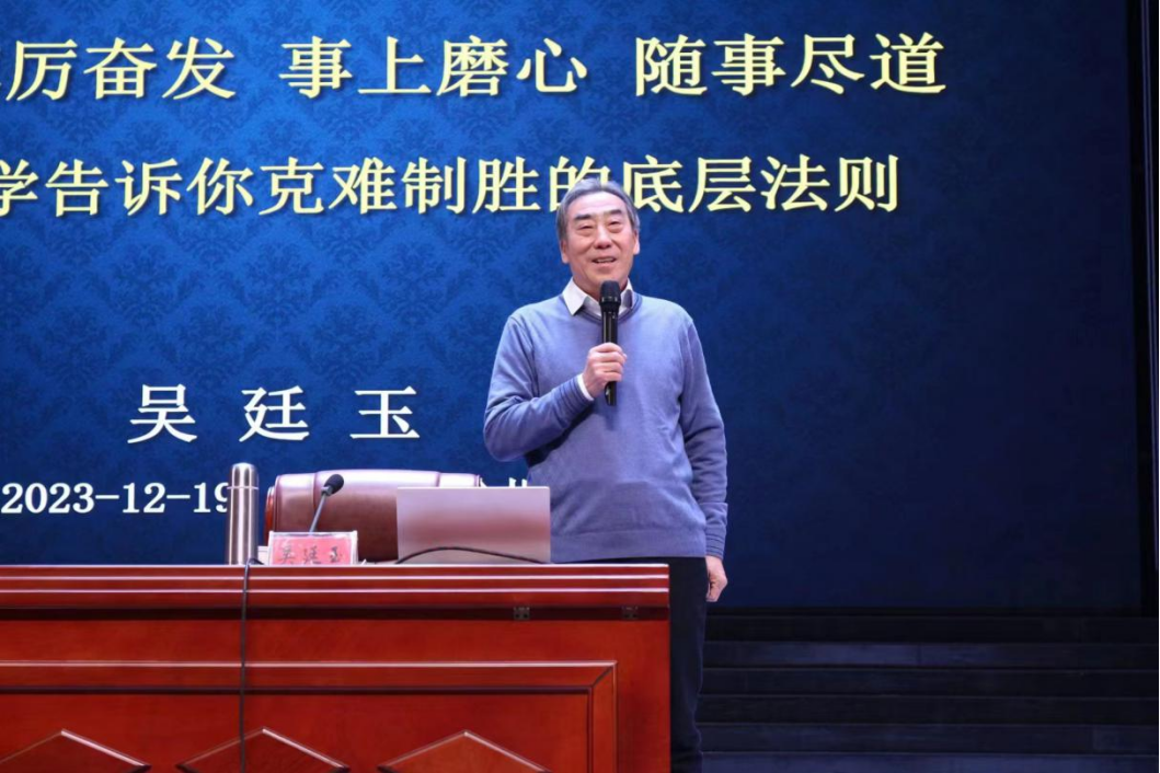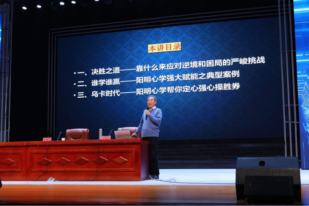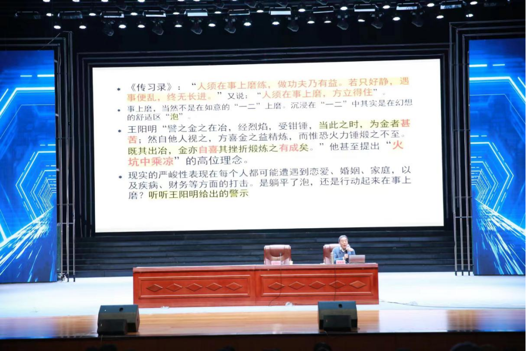 12月19日,文学院邀请著名学者吴廷玉教授在齐越大讲堂举办《知行合一 踔厉奋发 事上磨心 随事尽道》阳明心学讲座。此次讲座由文学院院长王金萍主持,文学院、马克思主义学院、教育学院、政史学院约1000名师生代表聆听讲座。