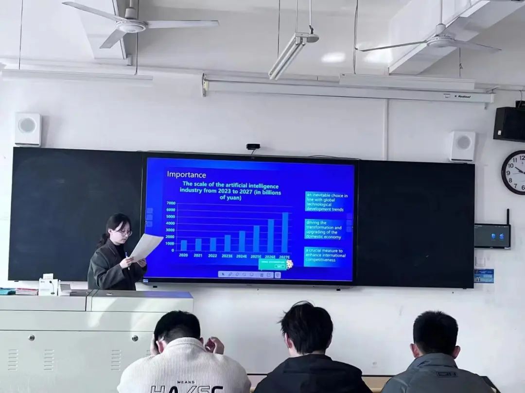 展示过程中,同学们精神饱满,妙语连珠,从不同的角度针对“经济分析中的神经网络和机器学习、企业营销模式”“人工智能的潜力、预测分析与流程自动化”等主题,阐述了自己的观点和看法,赢得了观众的阵阵掌声。评委老师针对各小组演讲过程中存在的问题给出相应修改建议,并鼓励同学们尽自己的最大努力做好此次参会准备,争取获得更好成绩。