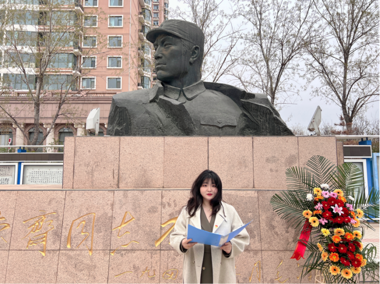 该学院2022级物理学专业一班学生吴新鹏在马本斋雕像前演讲,向以马本斋同志为代表的抗日英雄们表达了缅怀之情,并带领同学们重温了入团誓词。