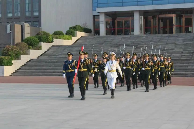 清晨七点,升旗仪式正式开始。英姿飒爽的国旗护卫队的同学们步履铿锵,目光坚定,伴着晨曦,迈着庄严的步伐,护送鲜艳的五星红旗来到升旗台前。随着雄壮激昂的《义勇军进行曲》响起,全体师生肃立,行注目礼。在嘹亮的国歌声中,鲜艳的五星红旗沐浴在晨光中冉冉升起。