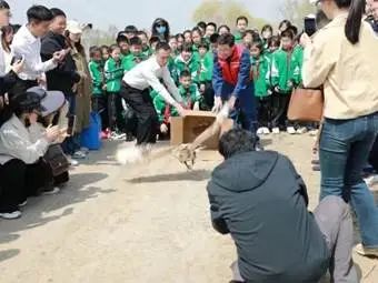 沧州市水月寺小学学生宣读了爱鸟护鸟倡议书并纷纷在活动条幅上签字,随后还向沧州市野生动物救护中心捐赠了学生筹集的爱心捐款。