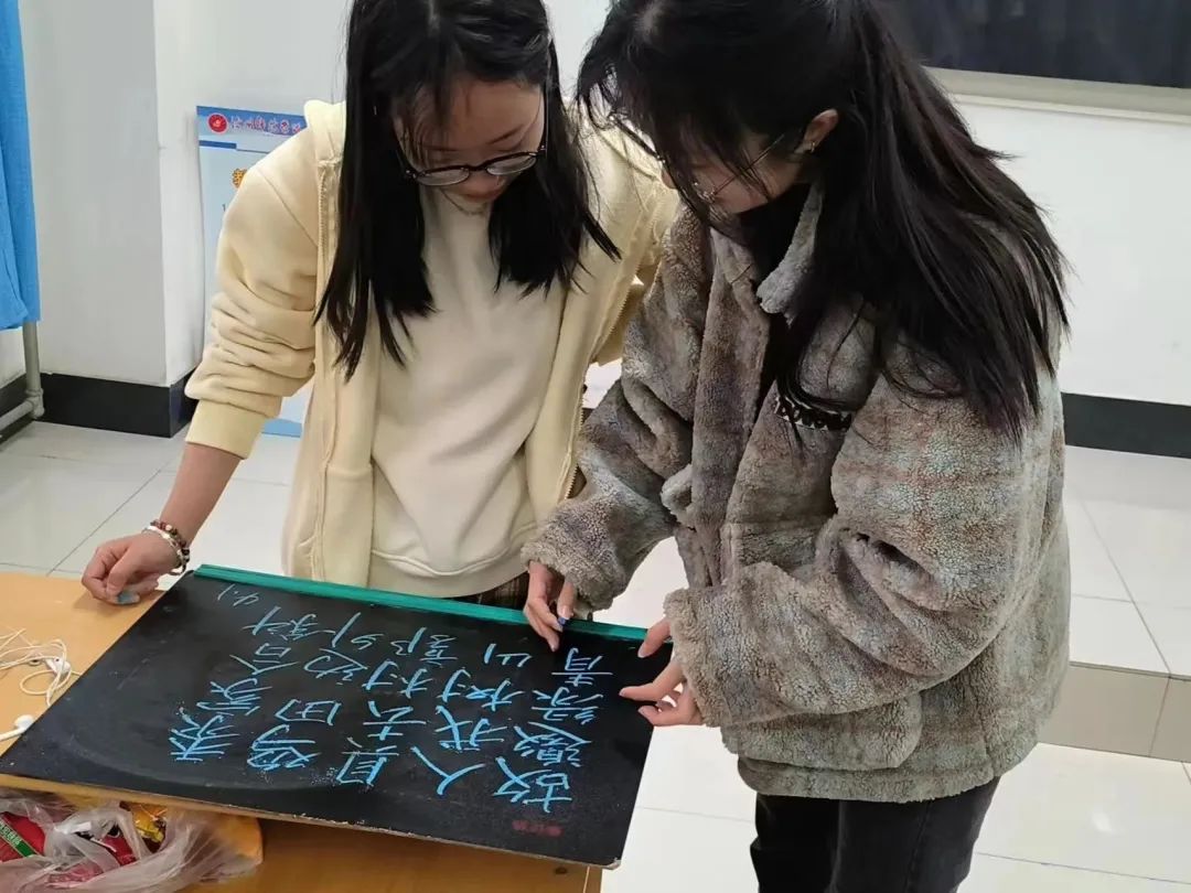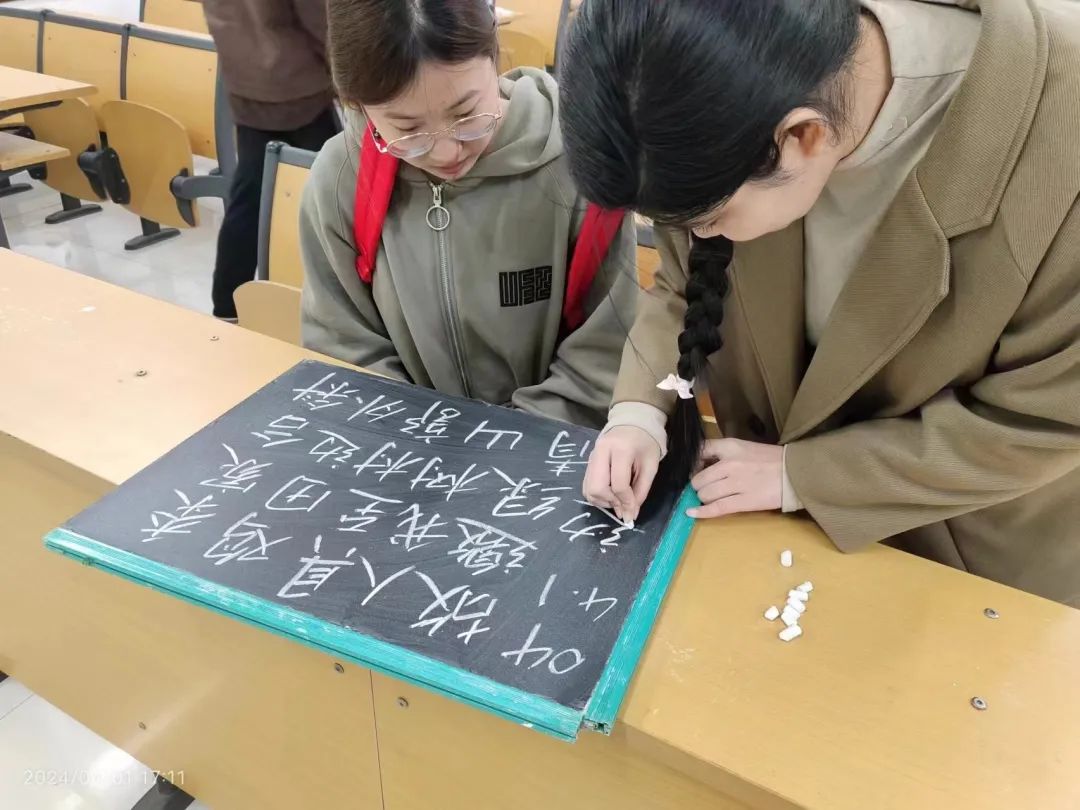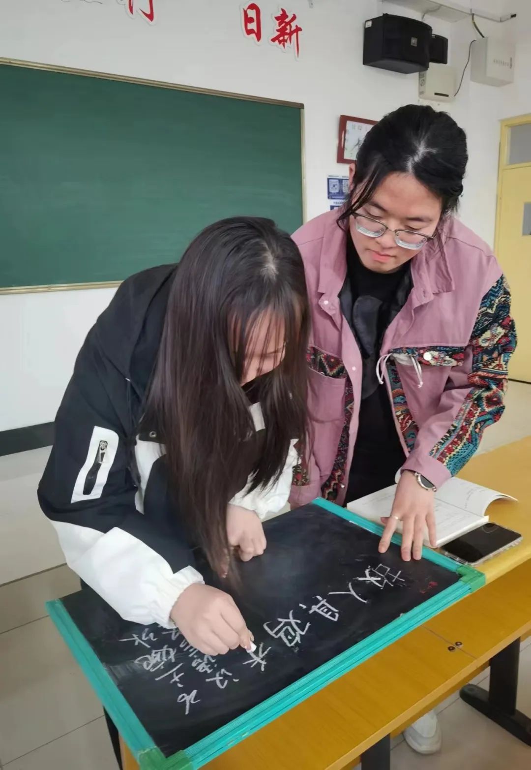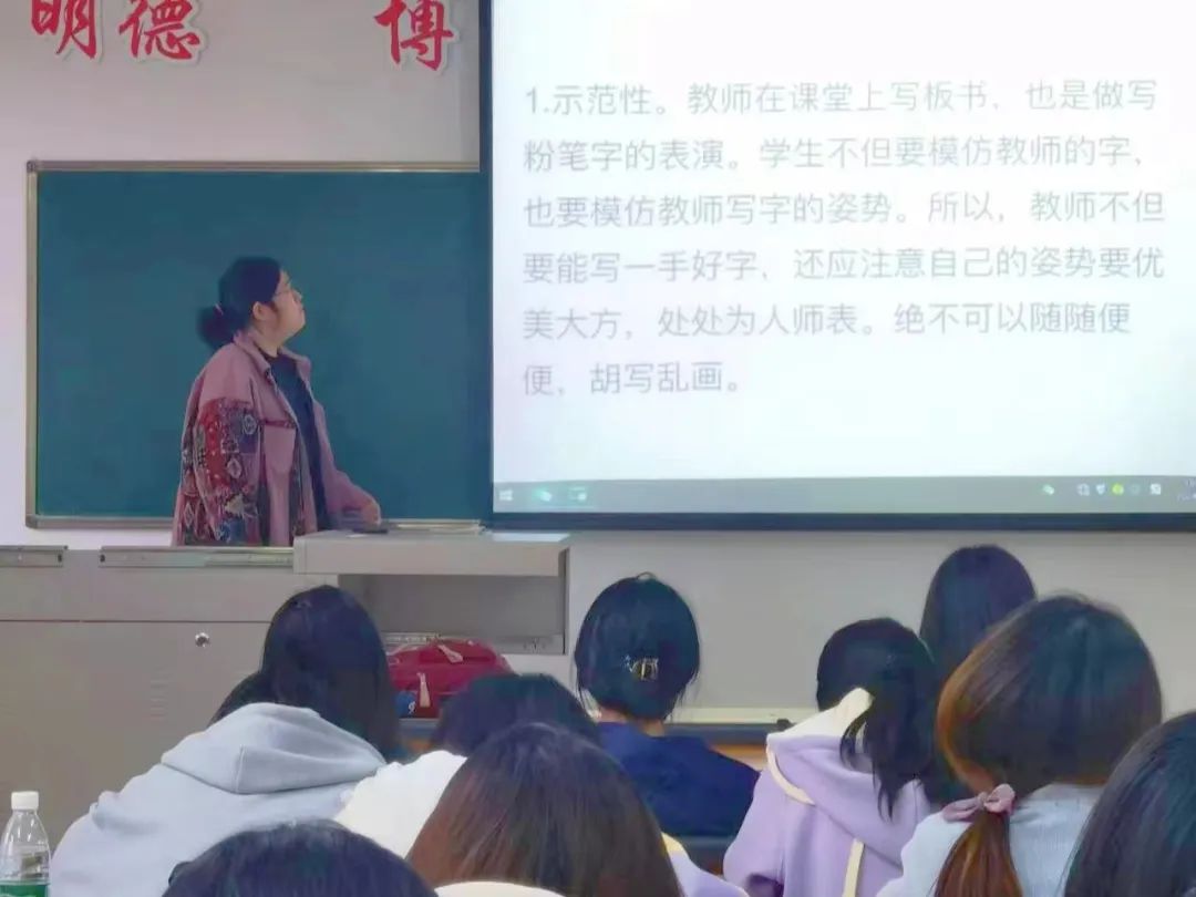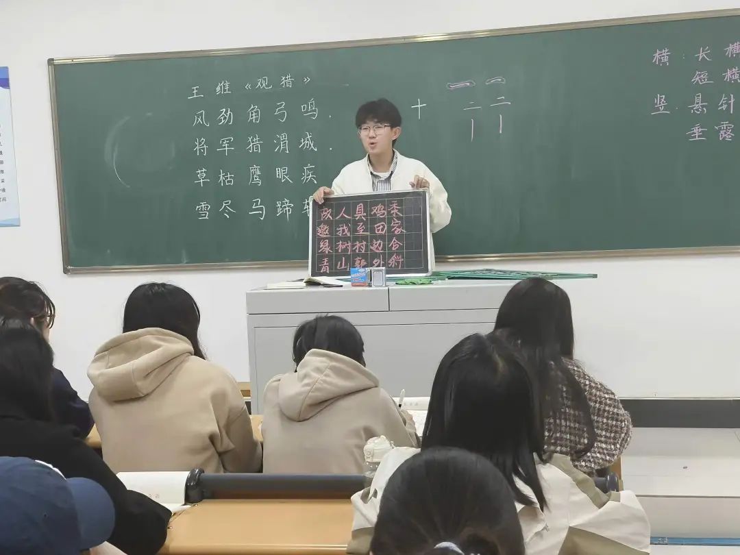 文学院充分利用书法学专业优势,选取书法学优秀学生代表,并组织汉语言文学专业高年级两笔字获奖的同学,面向2023级师范生进行两笔字书写指导。每班各配备两名同学,分别进行粉笔字和硬笔字授课,内容为改正本周两笔字练习中产生的问题,以及下一周书写内容的重点提示。